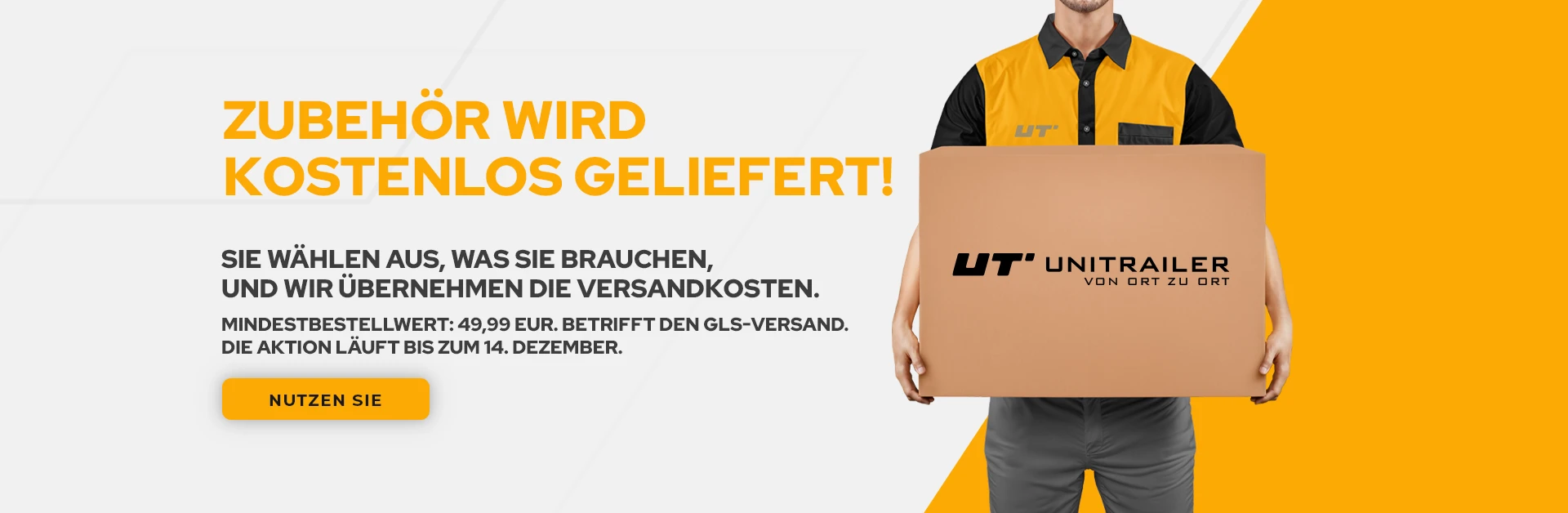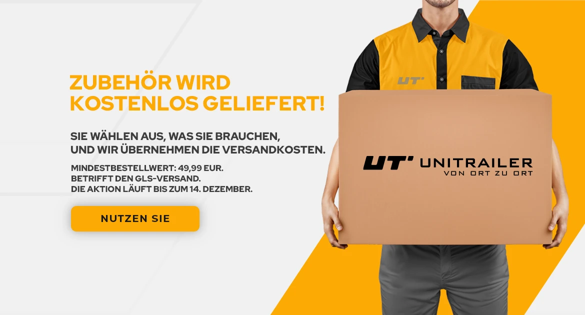 Der Unitrailer-Onlineshop wurde eingerichtet, um der wachsenden Nachfrage nach Ersatzteilen Anhänger gerecht zu werden. Wir bieten eine breite Palette von Produkten an: Stützräder, Felgen, Reifen, Kotflügel und Klappen, Kupplungen und Auflaufeinrichtungen, Zugvorrichtungen, Achsen und Aufhängungselemente sowie PKW-Anhänger selbst. Benötigen Sie zuverlässiges Zubehör? Interessieren Sie sich für Beleuchtung, Elektrik, oder suchen Sie vielleicht Teile für Ihre Bootsanhänger? In unserem Shop finden Sie alle Teile, die Sie für Pkw-Anhänger, Bootsanhänger, Wohnwagen und Autotransporter benötigen. An einem Ort, mit kompetentem Service und schnellem Versand.