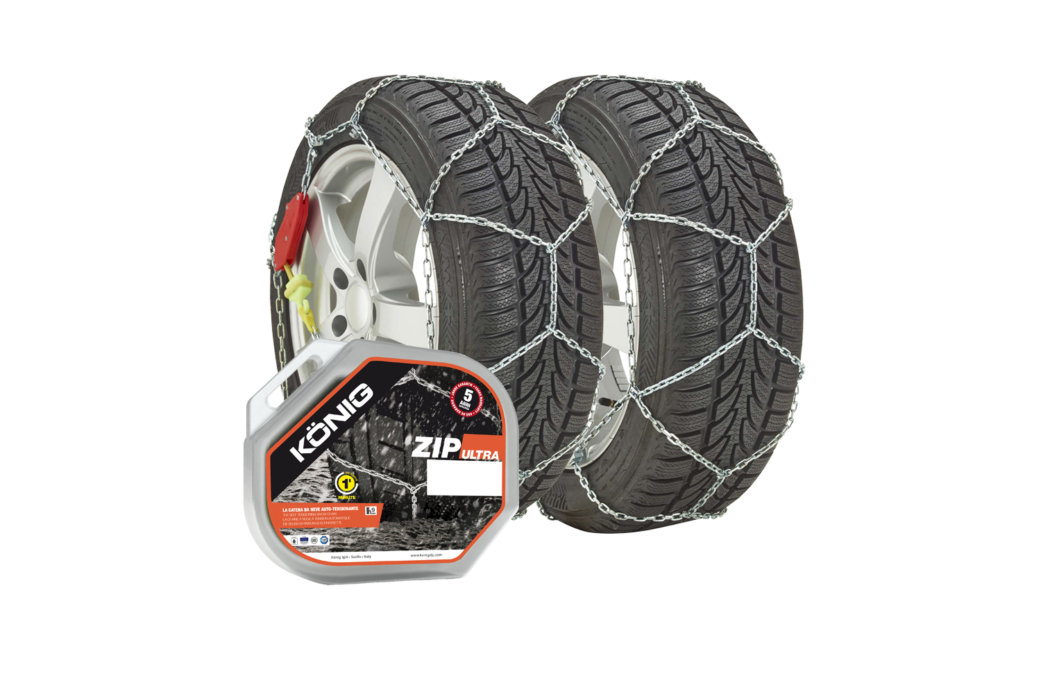 • König Zip 9 Ultra – Schneeketten mit automatischer Spannung. 9 mm starke Glieder bieten zuverlässige Traktion, während gehärteter Stahl die Haltbarkeit erhöht. Einfache Montage und Sicherheit auf winterlichen Straßen in ganz Europa.