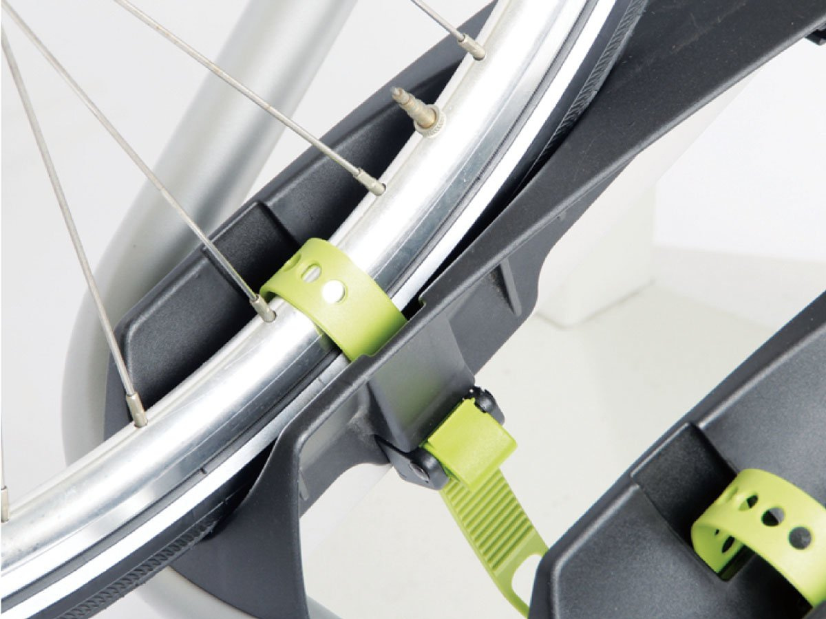 - Die Befestigung der Fahrradräder an den Plattformträgern erfolgt über stabile Zahnriemen.