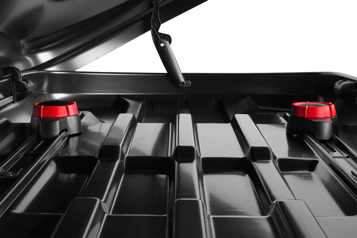 Das Zwei-Wege-Öffnungssystem ermöglicht bequemen Zugang sowohl vom Gehweg als auch von der Straße aus, was sich auf überfüllten Parkplätzen oder langen Fahrten mit häufigen Pausen als äußerst praktisch erweist. Der Deckel wird von federbelasteten Antrieben getragen, die ihn beim Befüllen festhalten und beim Schließen festziehen, wodurch die gesamte Struktur zusätzlich abgedichtet wird. Ein zentrales Schließsystem mit Dreipunktverriegelung verriegelt die Box mit einer einzigen Bewegung. Der Schlüssel kann erst abgezogen werden, wenn der Deckel ordnungsgemäß geschlossen ist . So ist die vollständige Sicherheit Ihrer Sachen gewährleistet.
