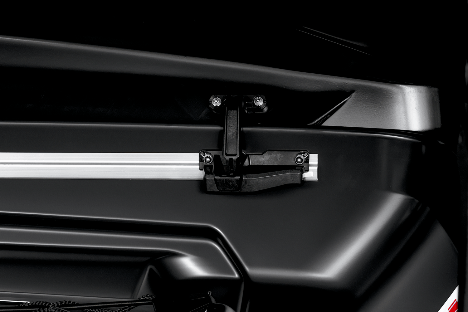 Dank der verschiebbaren Schienen lässt sich die Box an Holmabstände von 46 bis 115 cm anpassen. Ein eingebauter Kraftmesser signalisiert die korrekte Montage, verhindert ein zu festes Anziehen und schützt so sowohl die Box als auch den Dachträger.