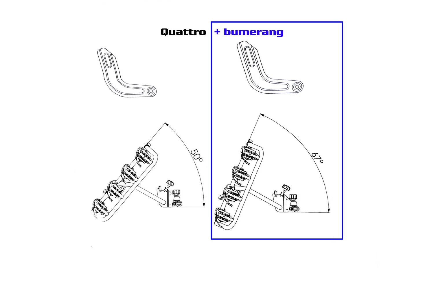 - Der „Boomerang“-Begrenzer erhöht den Neigungswinkel der Plattform auf 67 Grad. Passend für die Inter Pack Quattro- und Trio-Plattformen.