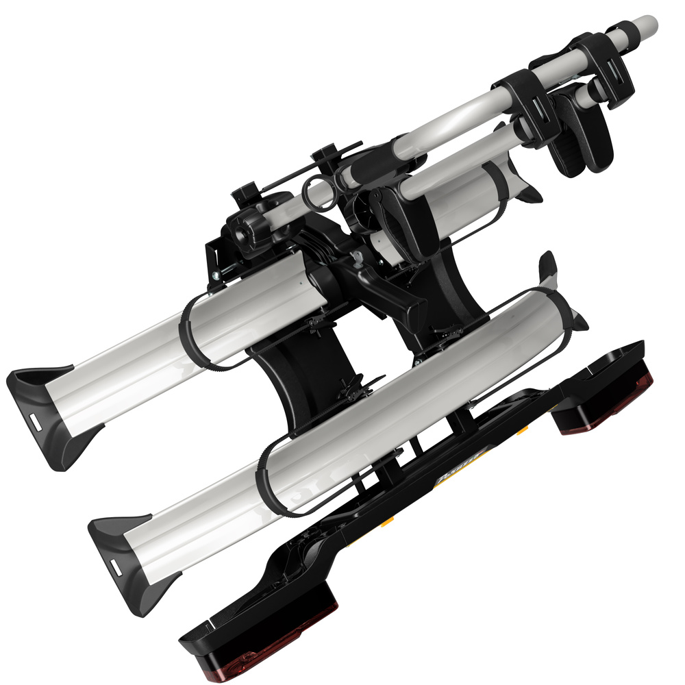 Entwickelt für den Transport von E-Bikes und Fatbikes, ermöglicht sie den Transport von Fahrrädern mit einem Gesamtgewicht von bis zu 60 kg . Neue, verlängerte und breite Schienen, die das Fahrrad tragen, ermöglichen den Transport von Fahrrädern mit einem Radstand von bis zu 1350 mm und einer Reifenbreite von bis zu 12,7 cm. Trotz der hohen Tragfähigkeit der Plattform beträgt ihr Gewicht dank der Verwendung von Aluminium nur 18,2 kg . Für mehr Komfort ist die Plattform mit Rädern ausgestattet, die eine Führung am Boden ermöglichen.