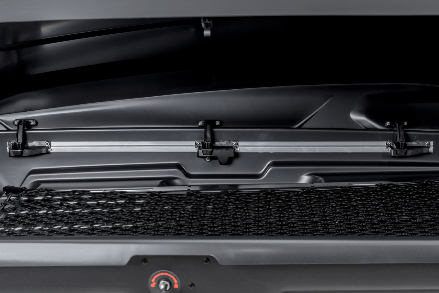 Dank beweglicher Führungen passt sich die Halterung an Stangenabstände von 40 bis 100 cm an. Rapid Fit ist mit einem Dynamometer ausgestattet, das die ordnungsgemäße Montage signalisiert und vor zu starkem Anziehen schützt, wodurch das Risiko einer Beschädigung der Box oder des Kofferraums ausgeschlossen wird.