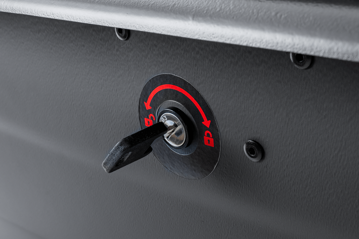 Die Box ist mit einem Haken und massiven U-Bügeln an der Plattform befestigt.
