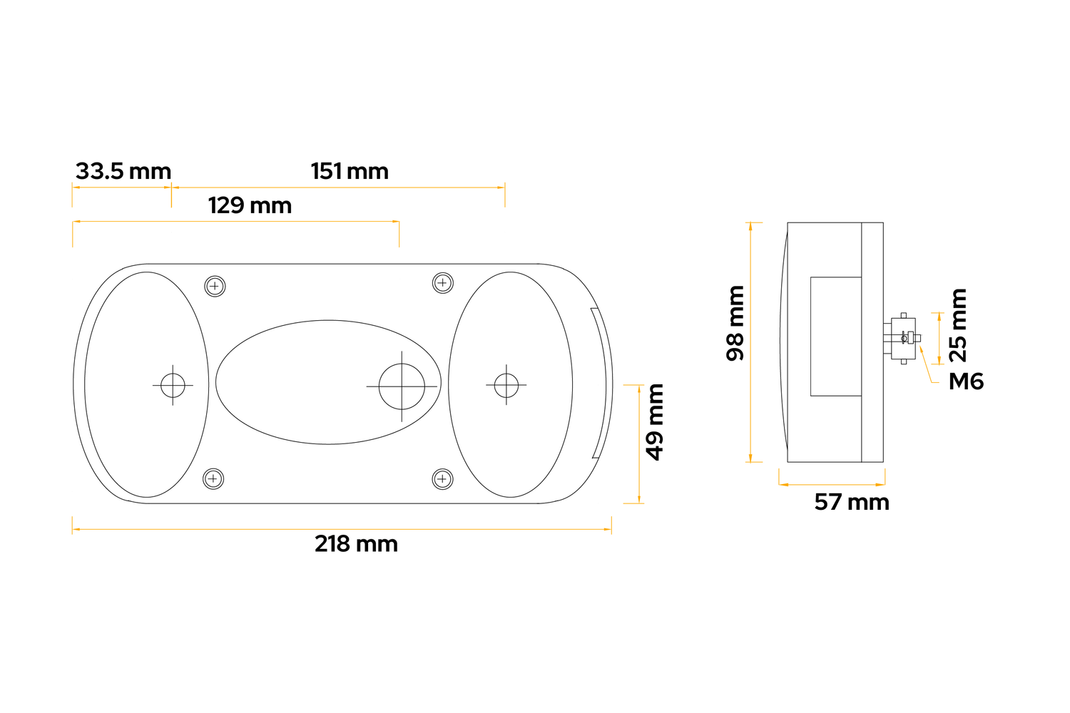 Die Midipoint II Rückleuchte von ASPÖCK ist für den Einbau sowohl auf der linken als auch auf der rechten Fahrzeugseite vorgesehen und hat folgende Abmessungen: Breite 218 mm, Höhe 98 mm, Tiefe 57 mm. Ausgestattet mit einem 5-poligen Bajonettanschluss ermöglicht es eine einfache und schnelle Installation in Anhängern, Bussen und Abschleppwagen.