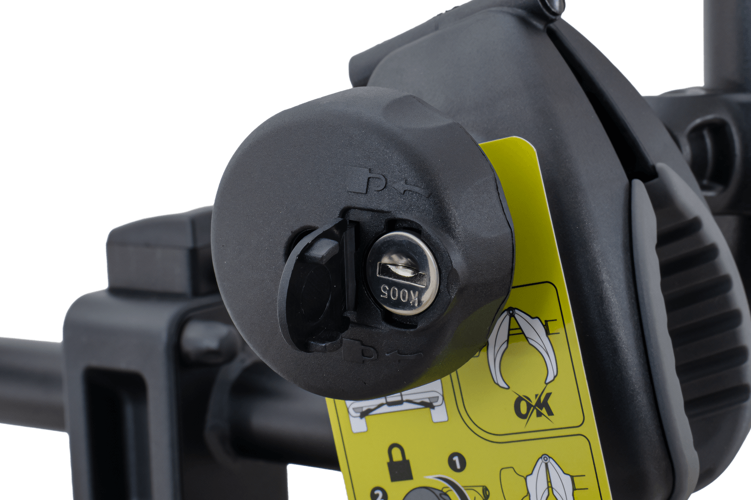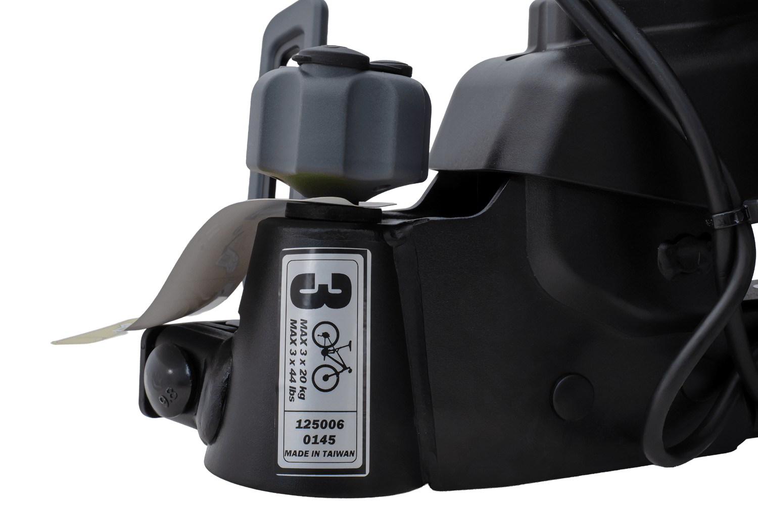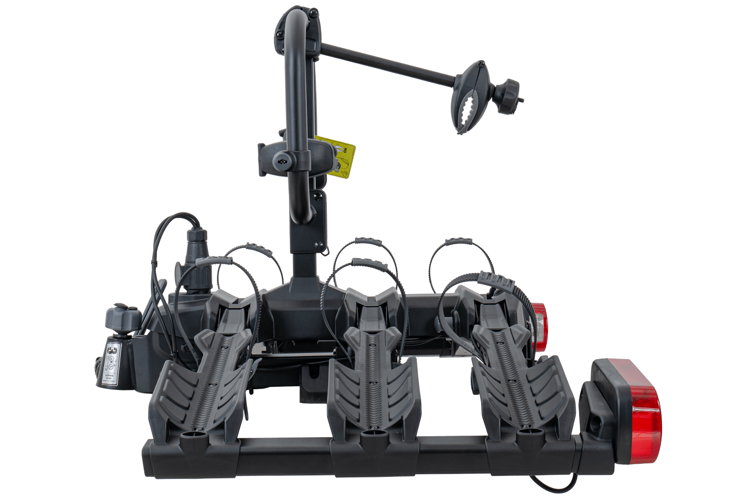 Dank ihres kompakten Designs und der klappbaren Stützen nimmt die Plattform im zusammengeklappten Zustand sehr wenig Platz ein – sie passt problemlos in den Kofferraum eines Autos, in den Keller oder sogar in einen Abstellraum. Der Träger lässt sich bequem tragen und die Montage ist schnell und intuitiv – alles dank des bewährten Conical System -Mechanismus, der die Plattform fest auf der Anhängerkupplungskugel festklemmt. Jedes der drei Fahrräder ist auf einer separaten Halterung mit separatem Schlüsselschloss montiert, was nicht nur vollständige Sicherheit gewährleistet, sondern auch das Auf- und Absteigen des jeweiligen Fahrrads erleichtert. Diese Halterungen sind um 360° drehbar und mit einer weichen Gummischutzschicht überzogen, die Schäden am Rahmen verhindert. Die Fahrradräder werden mithilfe verstärkter Zahnriemen auf breiten, soliden Stützen stabilisiert, die mit Gummipads ausgestattet sind, die die Felgen schützen und die Traktion verbessern.