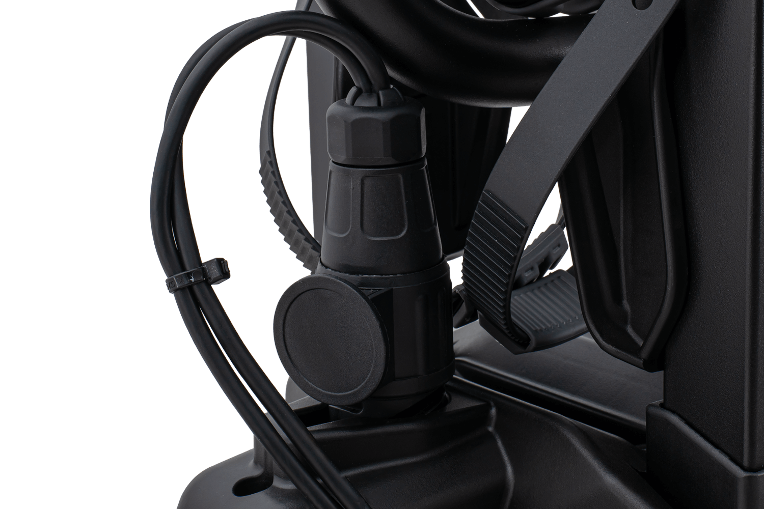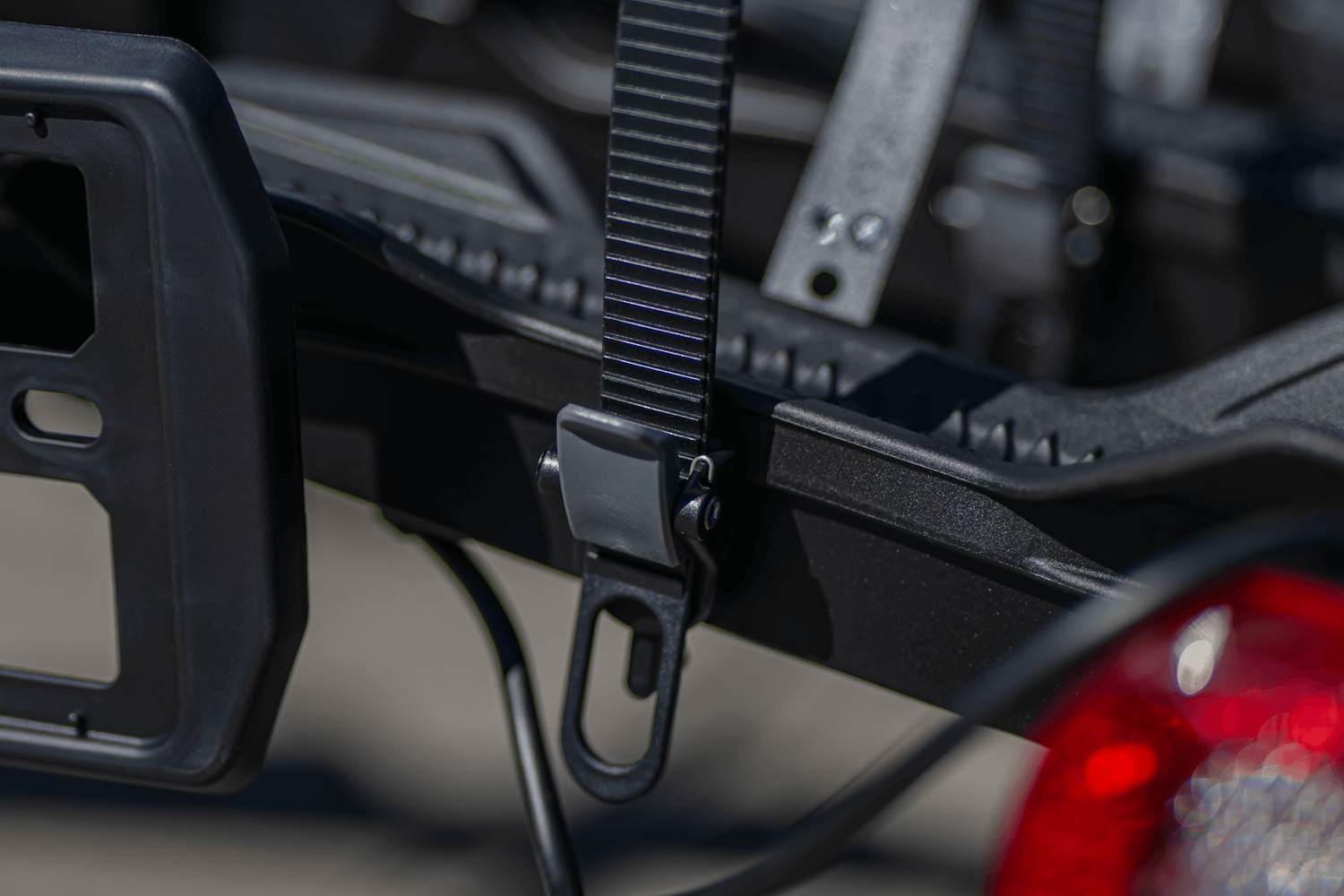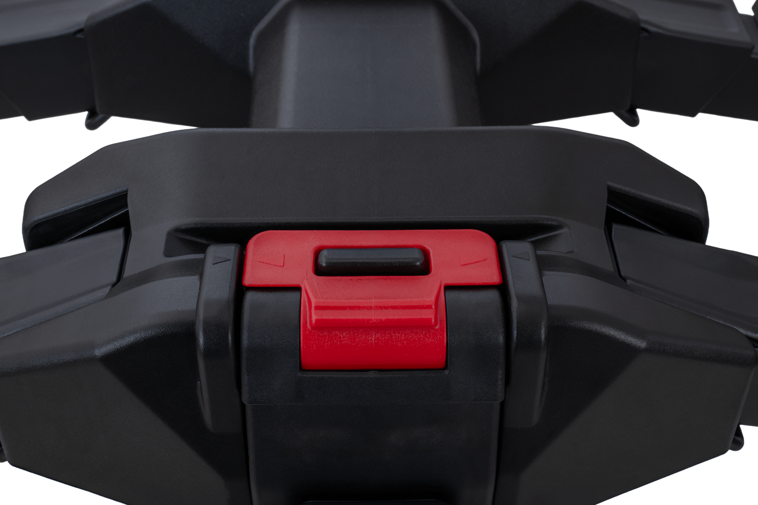 Dank ihres kompakten Designs und der klappbaren Stützen nimmt die Plattform im zusammengeklappten Zustand sehr wenig Platz ein – sie passt problemlos in den Kofferraum eines Autos, in den Keller oder sogar in einen Abstellraum. Der Träger lässt sich bequem tragen und die Montage ist schnell und intuitiv – alles dank des bewährten Conical System -Mechanismus, der die Plattform fest auf der Anhängerkupplungskugel festklemmt. Jedes der drei Fahrräder ist auf einer separaten Halterung mit separatem Schlüsselschloss montiert, was nicht nur vollständige Sicherheit gewährleistet, sondern auch das Auf- und Absteigen des jeweiligen Fahrrads erleichtert. Diese Halterungen sind um 360° drehbar und mit einer weichen Gummischutzschicht überzogen, die Schäden am Rahmen verhindert. Die Fahrradräder werden mithilfe verstärkter Zahnriemen auf breiten, soliden Stützen stabilisiert, die mit Gummipads ausgestattet sind, die die Felgen schützen und die Traktion verbessern.