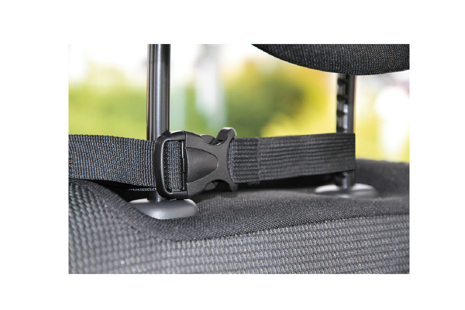 Eine transparente Tablet-Tasche ermöglicht die Bedienung des Touchscreens, ohne das Gerät herausnehmen zu müssen , und schützt es gleichzeitig vor Schmutz. Robuste Schnallen und verstellbare Gurte um die Kopfstütze sorgen für einen sicheren Sitz an der Rückenlehne, und das Anbringen und Abnehmen ist ein Kinderspiel.