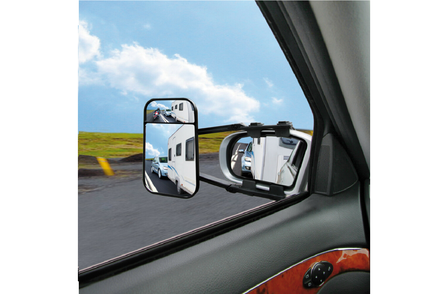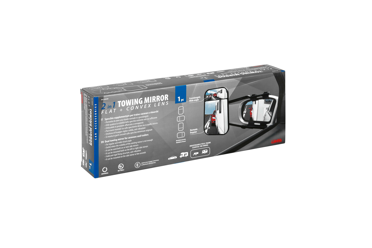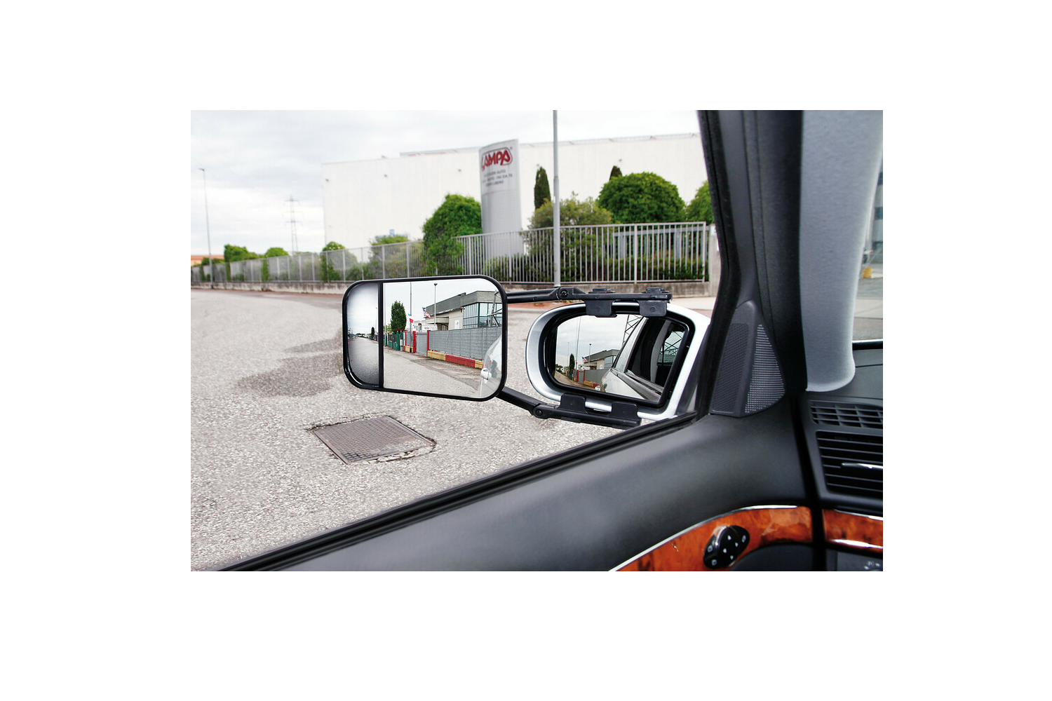Der flache und konvexe Anhängerspiegel ist ein universeller Zubehörspiegel , der am werkseitigen Seitenspiegel montiert wird . Das Doppelglas- Design erweitert den Sichtbereich, und die vollständige Verstellbarkeit ermöglicht den idealen Blickwinkel. Das Klemmmontagesystem passt an die meisten Spiegel; Leitergurte halten sie sicher an Ort und Stelle und reduzieren Vibrationen während der Fahrt. Der Spiegel ist universell einsetzbar und kann sowohl links als auch rechts am Fahrzeug montiert werden. Das Produkt ist ECE R46-zugelassen .