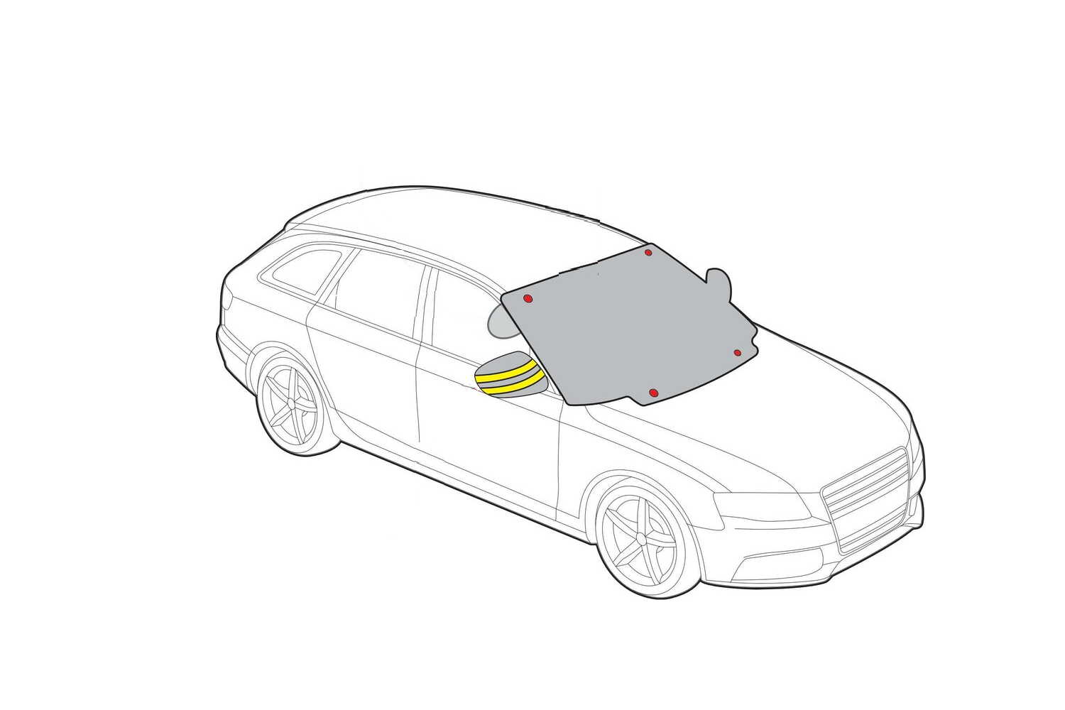 Der vierlagige Aufbau besteht aus einer laminierten PE-Folie mit Aluminium (reflektiert Sonnenlicht), Spunlaced-Baumwolle, Baumwoll-Komposit (Isolierung) und einer TNT-Innenschicht (weiche Schicht zum Lack). Fünf hochfeste Magnete (Ø 14 x 2 mm, je 1700–1800 G) sind in den Stoff eingenäht. Dadurch lässt sich die Abdeckung in Sekundenschnelle anbringen , ohne dass Wischer sie festhalten müssen – auch die Wischerblätter selbst bleiben abgedeckt und geschützt . Die Magnete sind im Stoff verborgen , wodurch Kratzer an der Karosserie vermieden werden . Eine Aufbewahrungsbox ist im Lieferumfang enthalten.