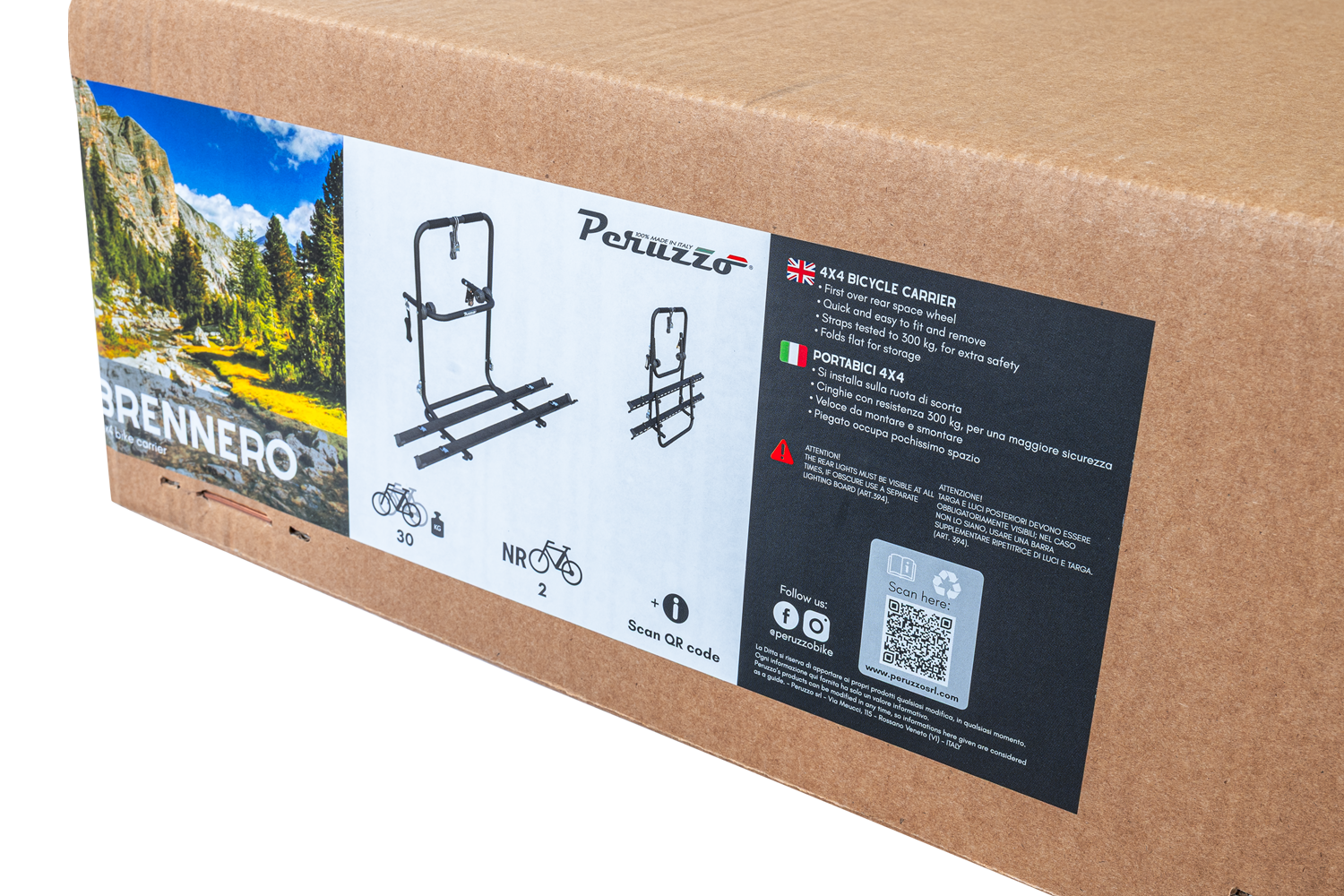 - Der Peruzzo Brennero 4x4 Fahrradträger, konzipiert für das Reserverad eines Geländewagens, ermöglicht den sicheren Transport von zwei Fahrrädern. Er verfügt über leichte Aluminiumschienen, einen korrosionsbeständigen Stahlrahmen und eine Tragkraft von 30