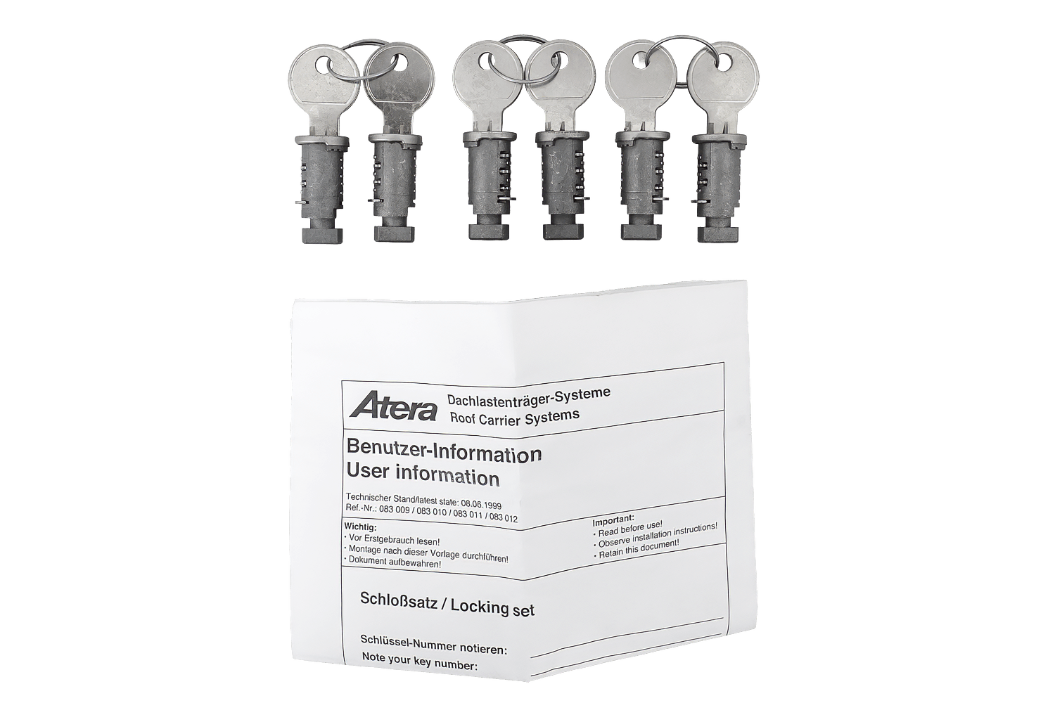 - Schlossset mit 6 Schlössern und 2 Schlüsseln für Atera-Produkte.