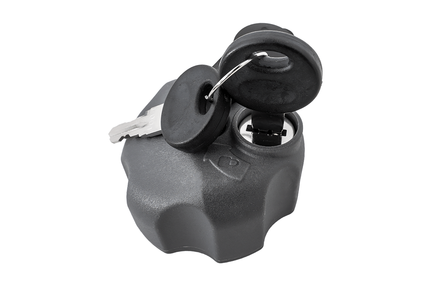 Sicherheitsknopf mit Schlüssel und ein Schloss mit der gleichen Nummer für das konische Montagesystem in Inter Pack Anhängerkupplungs-Fahrradplattformen.