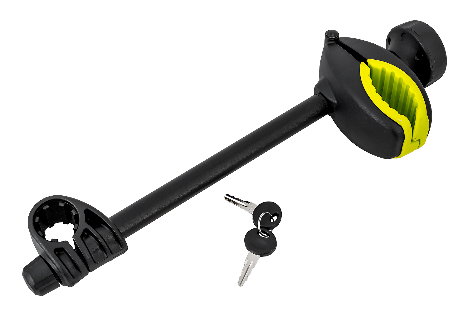 Eine komplette Fahrradrahmenhalterung mit Schloss und Schlüsseln für den Inter Pack Trio Fahrradträger. Ihre Länge ist so ausgelegt, dass das Fahrrad am nächsten zum Kennzeichen des Fahrradträgers gesichert wird.