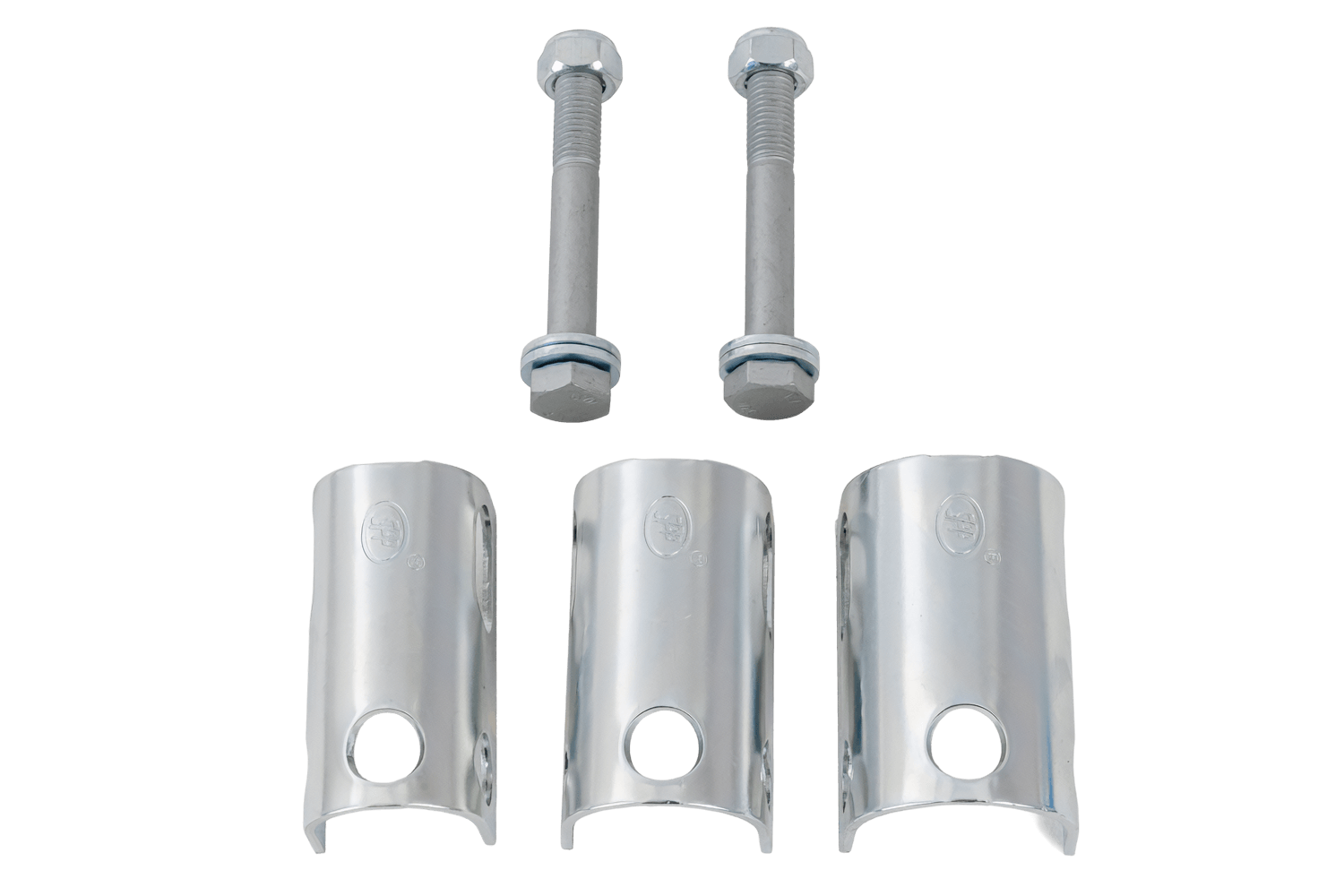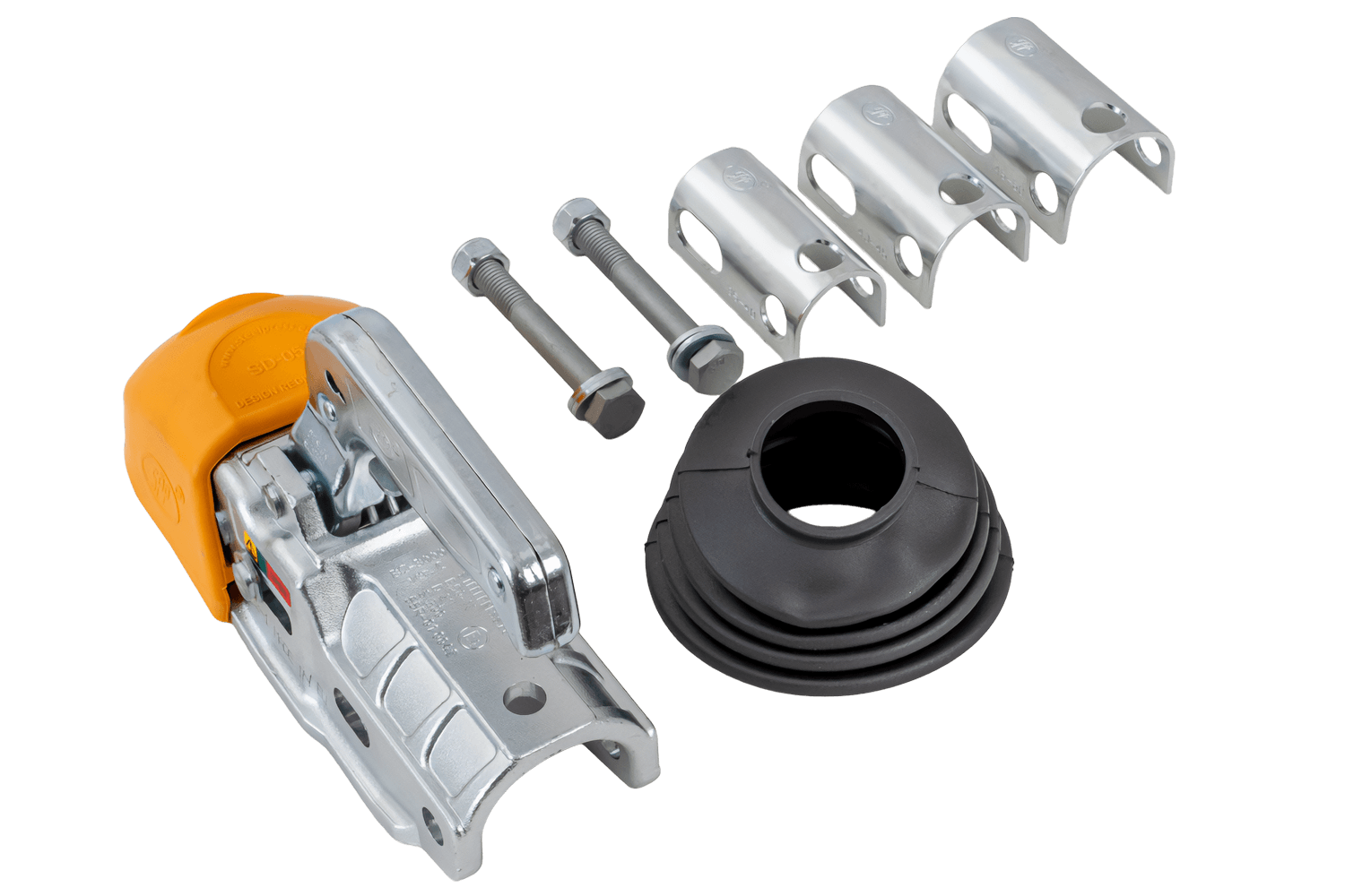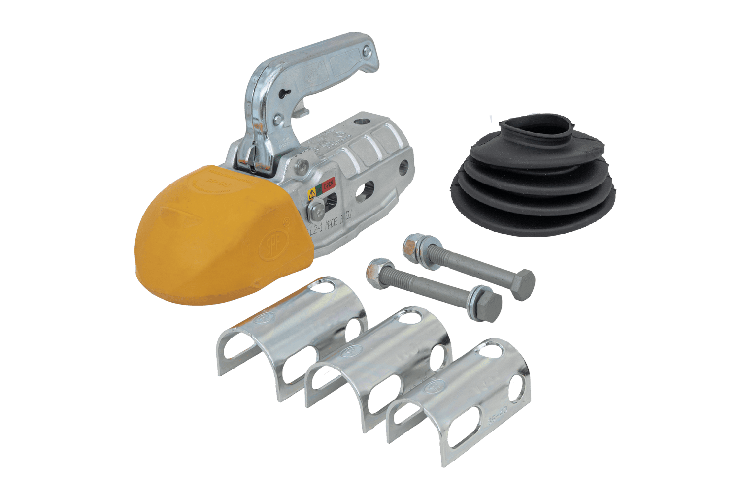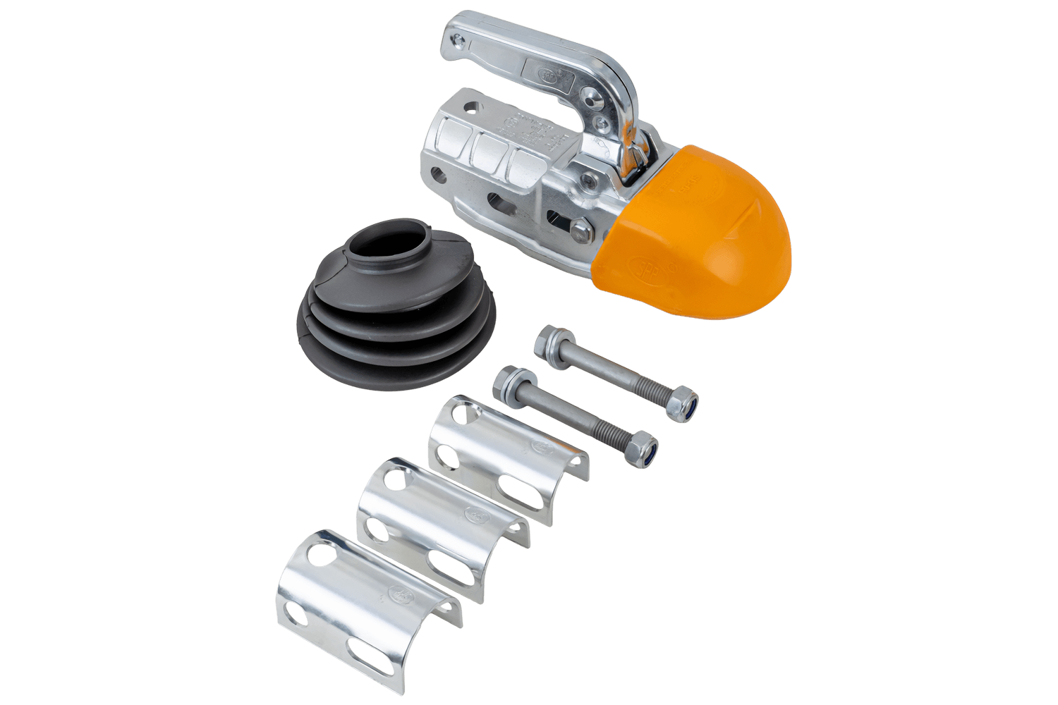 Das Set besteht aus: Kupplungskopf, Reduzieradaptern, Befestigungsschrauben, Safety Dock und Gummiabdeckung für die Auflaufeinrichtung. Das Safety Dock schützt das Fahrzeugheck vor Kratzern und die Beine des Nutzers vor Stößen beim Rangieren , während eine Gummimanschette das Tauchrohr abdeckt und so die Auflaufeinrichtung vor Schmutz und Feuchtigkeit schützt. Adapter machen den Deichselkopf kompatibel mit Auflaufeinrichtungen mit einem Tauchrohrdurchmesser von 35 mm bis 50 mm .
