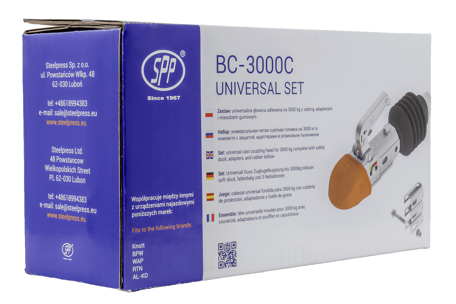 - Die Kugelkopfkupplung BC-3000C-00-00 aus Gusseisen ist für Anhänger mit einem Gewicht von bis zu 3000 kg ausgelegt. Der Kupplungskopf ist auf einer Rohrdeichsel montiert und wird mit Adaptern geliefert, die die Kompatibilität mit Auflaufeinrichtungen mit