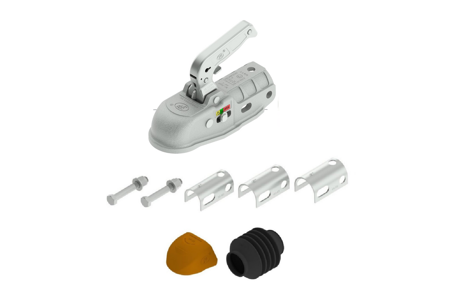 Das Set besteht aus: Kupplungskopf, Reduzieradaptern, Befestigungsschrauben, Safety Dock und Gummiabdeckung für die Auflaufeinrichtung. Das Safety Dock schützt das Fahrzeugheck vor Kratzern und die Beine des Nutzers vor Stößen beim Rangieren , während eine Gummimanschette das Tauchrohr abdeckt und so die Auflaufeinrichtung vor Schmutz und Feuchtigkeit schützt. Adapter machen den Deichselkopf kompatibel mit Auflaufeinrichtungen mit einem Tauchrohrdurchmesser von 35 mm bis 50 mm .