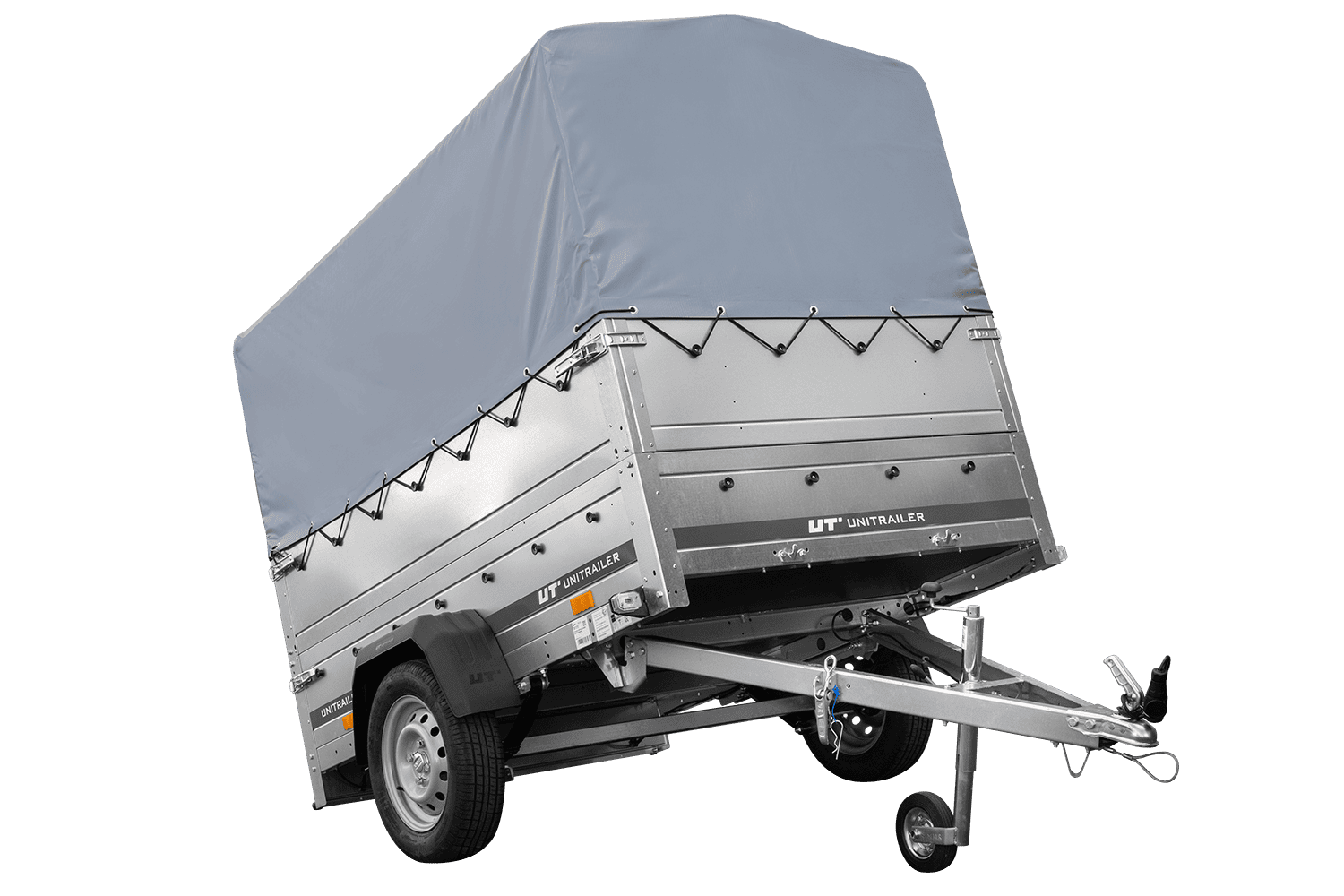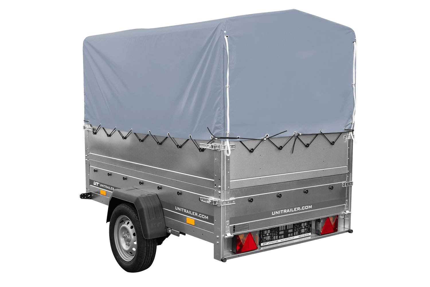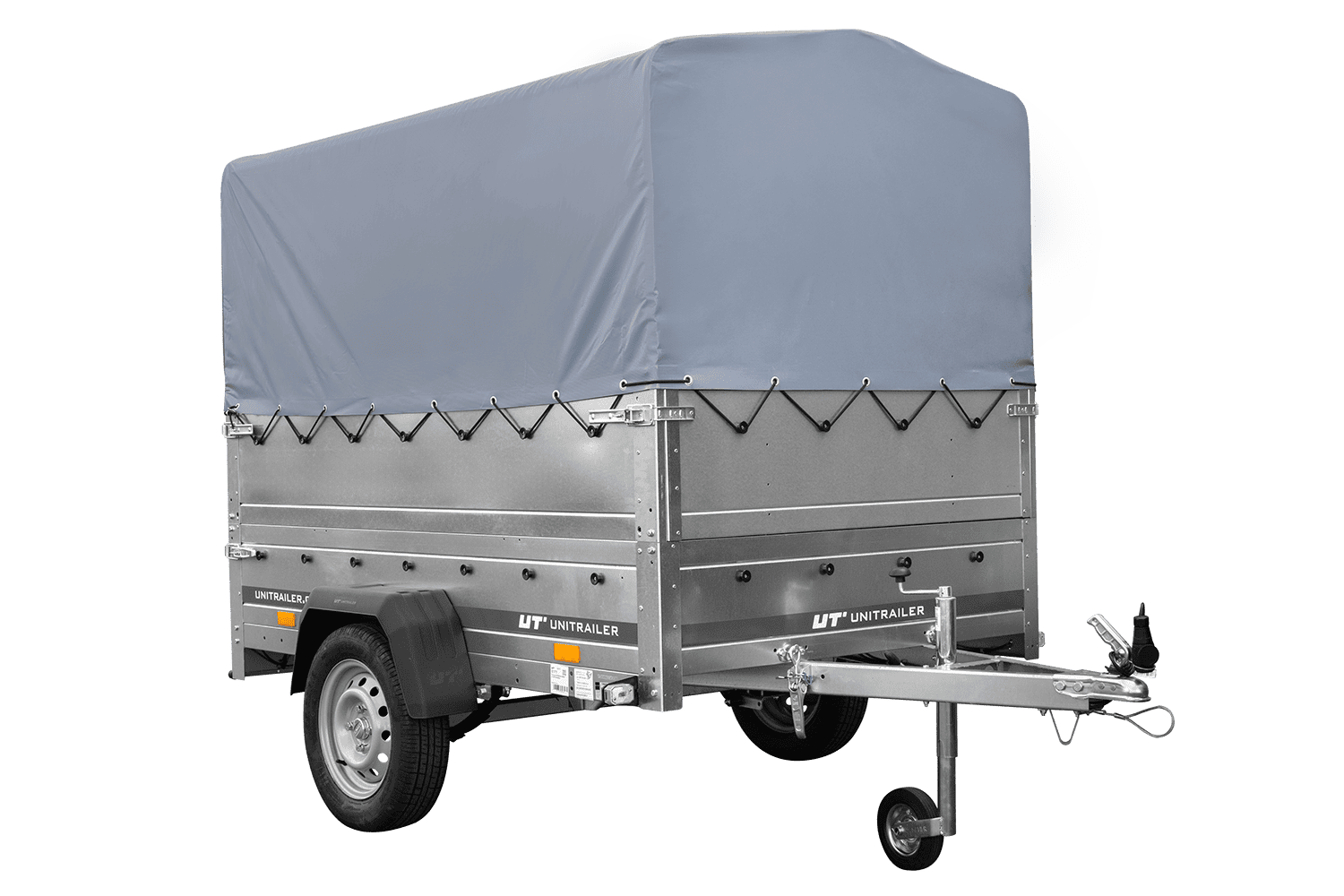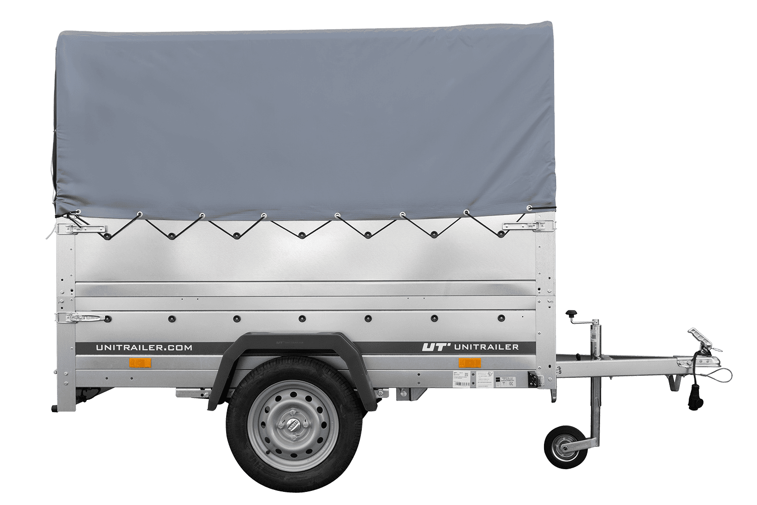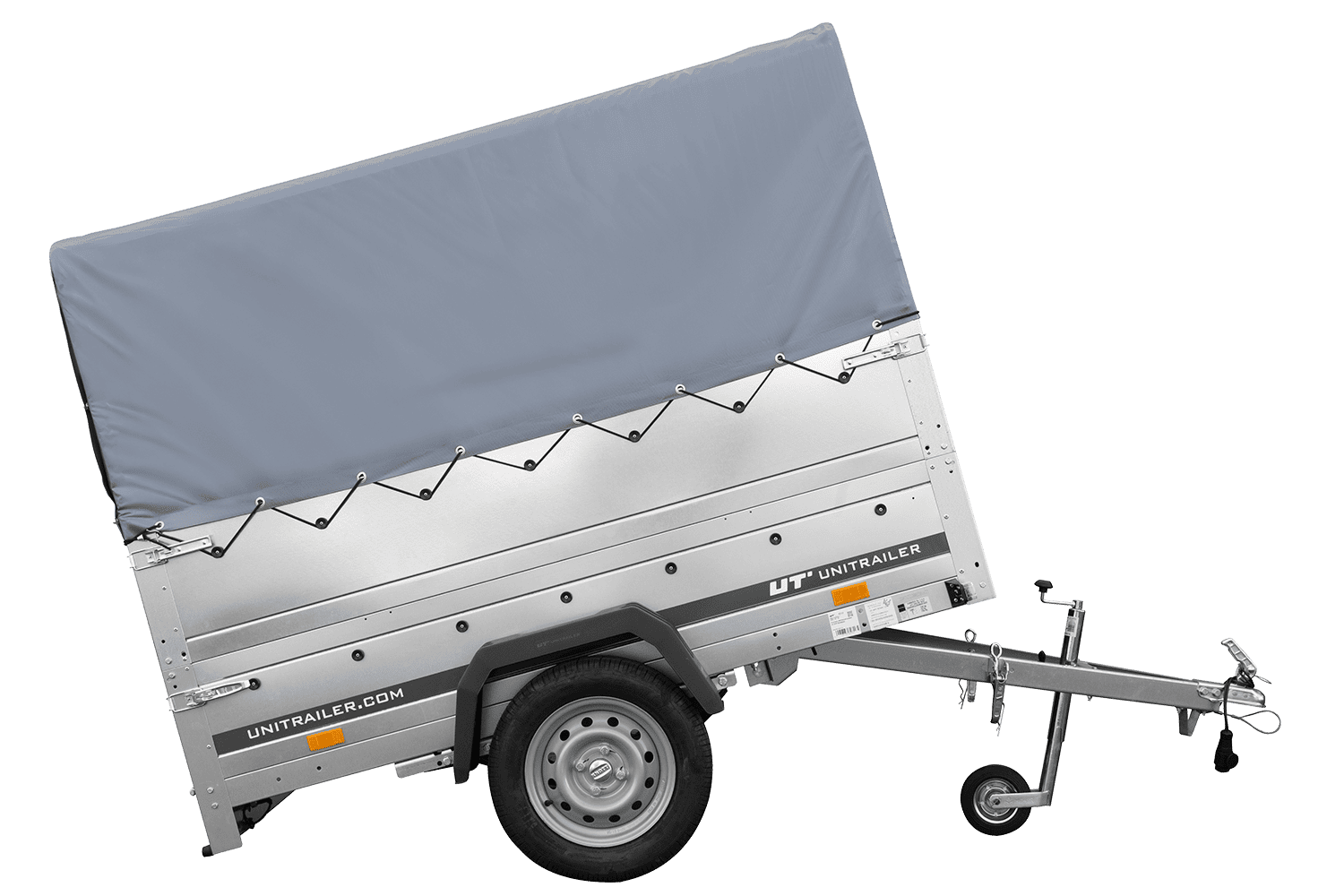 Leichtanhänger auf Blattfedern 200x125 UNITRAILER GARDEN 201/R KIPP mit BIS-Seiten, H-800-Rahmen und grauer Plane