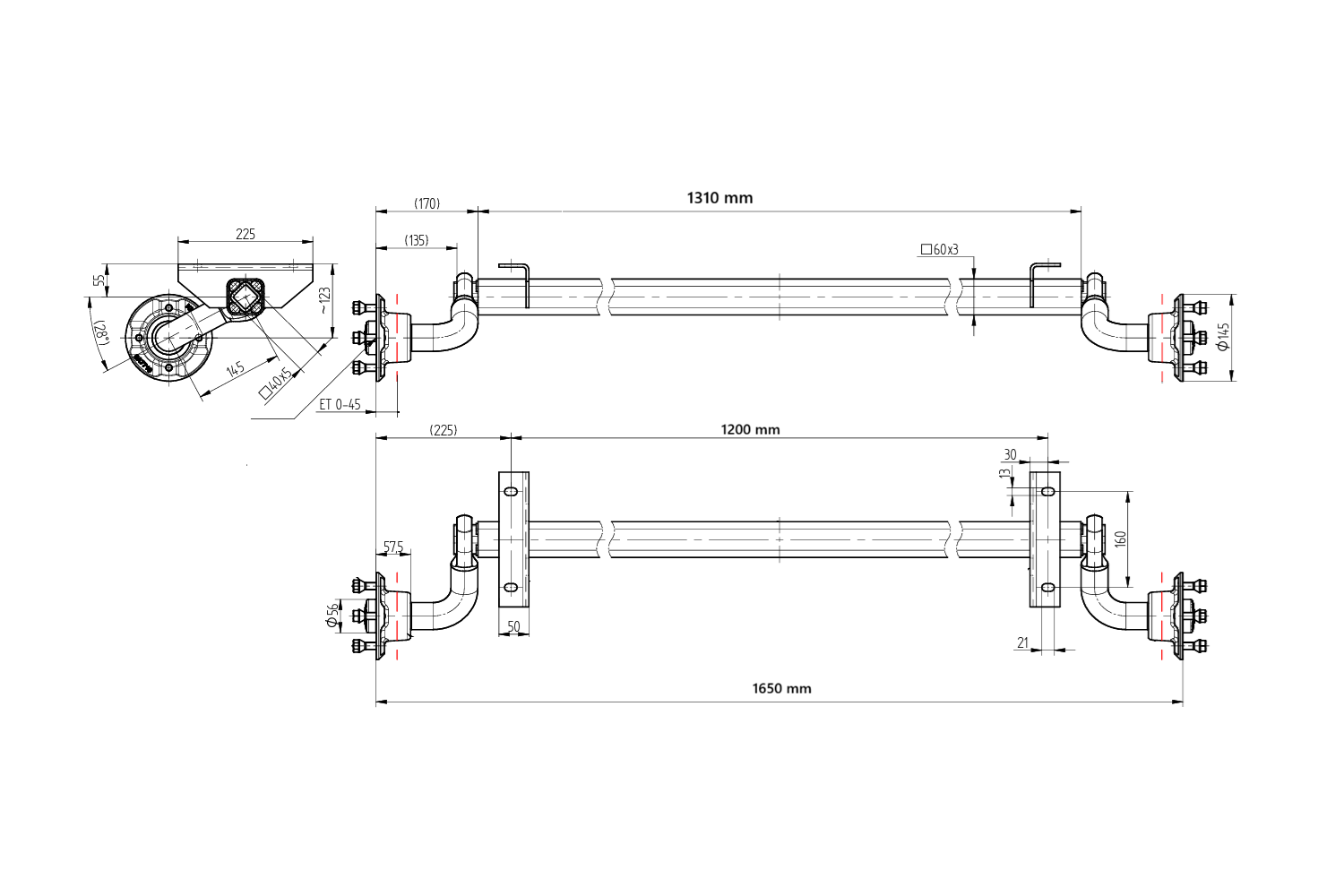 - KNOTT VG7-L ungebremste Anhängerachse mit einer maximalen Tragfähigkeit von 750 kg. Der Lochabstand beträgt 1200 mm, der Nabenabstand 1650 mm und das Lochmuster 4x100. Die Schwingarmlänge beträgt 145 mm.