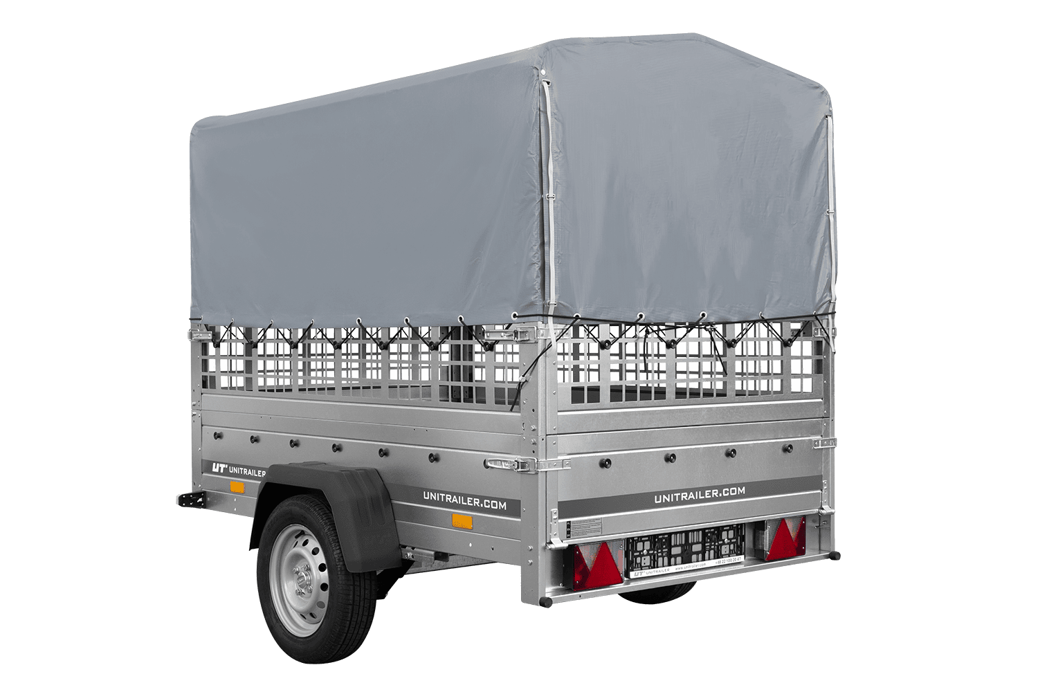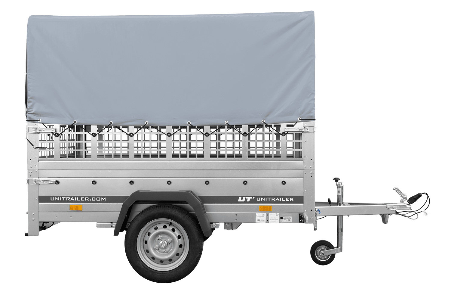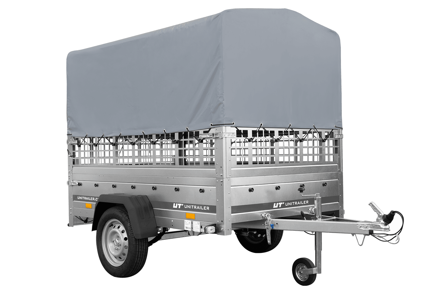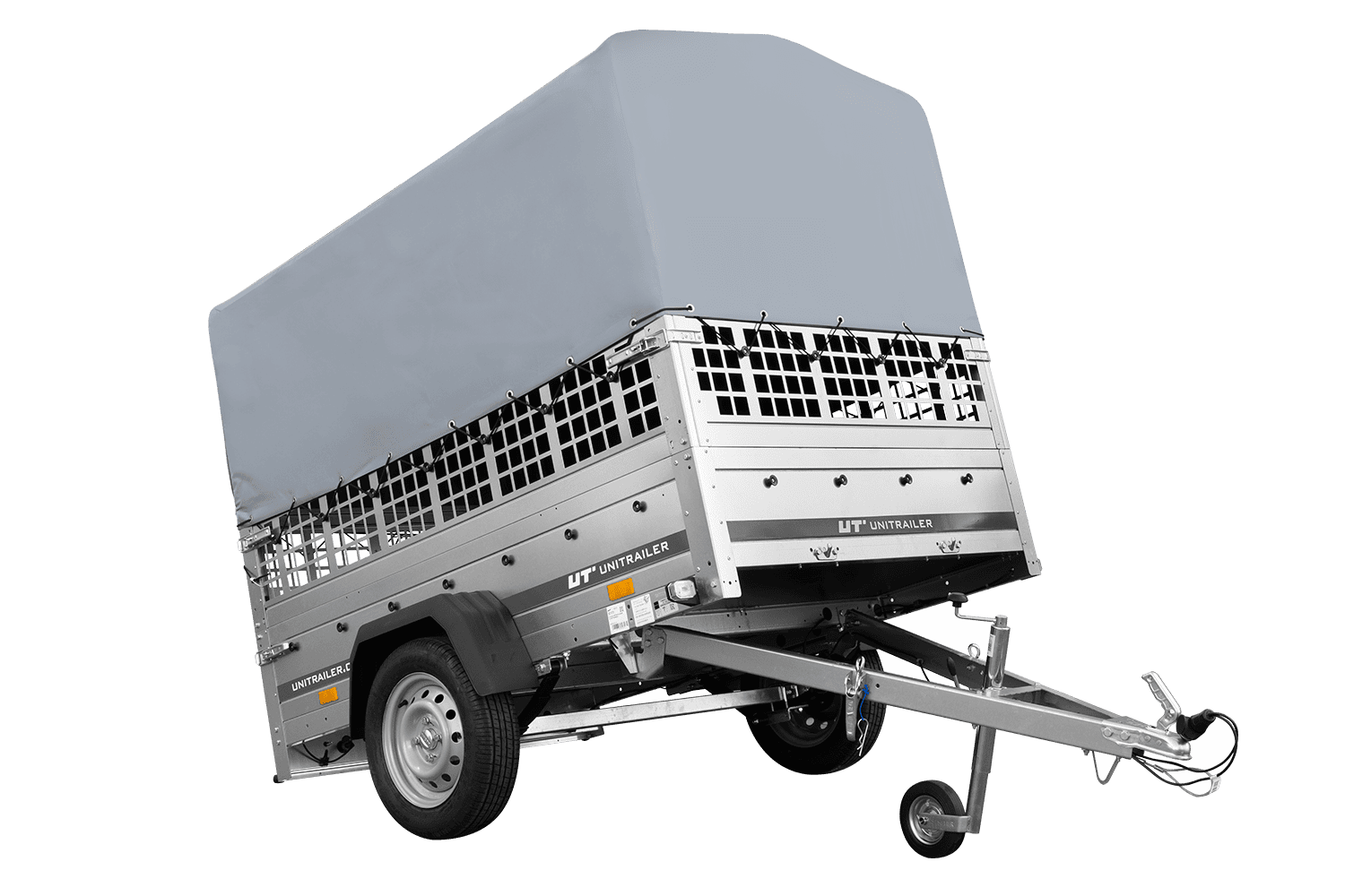 Einachsanhänger auf Federn 200x125 UNITRAILER GARDEN 201/R KIPP mit Gitterwänden, H-800-Rahmen und grauer Plane