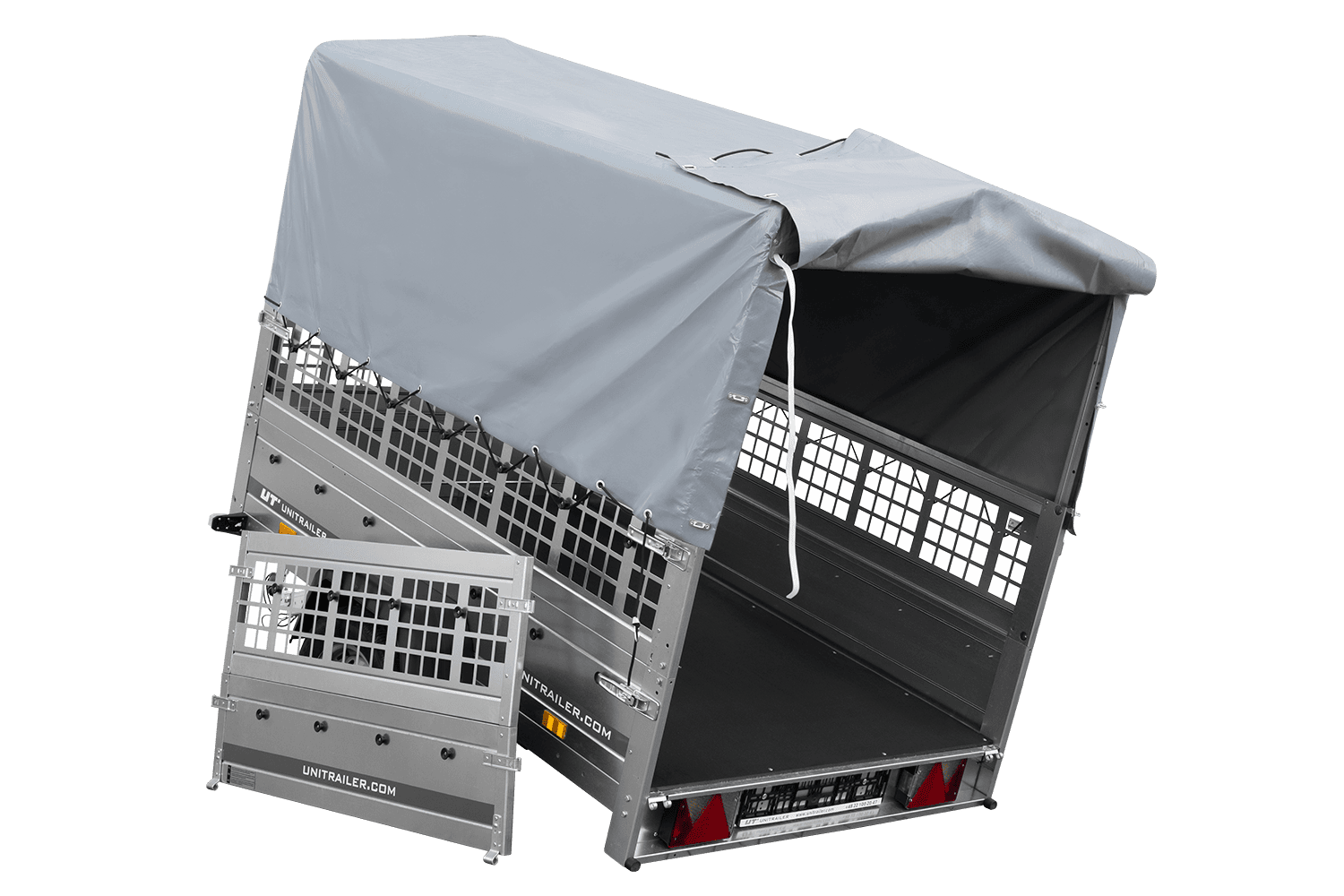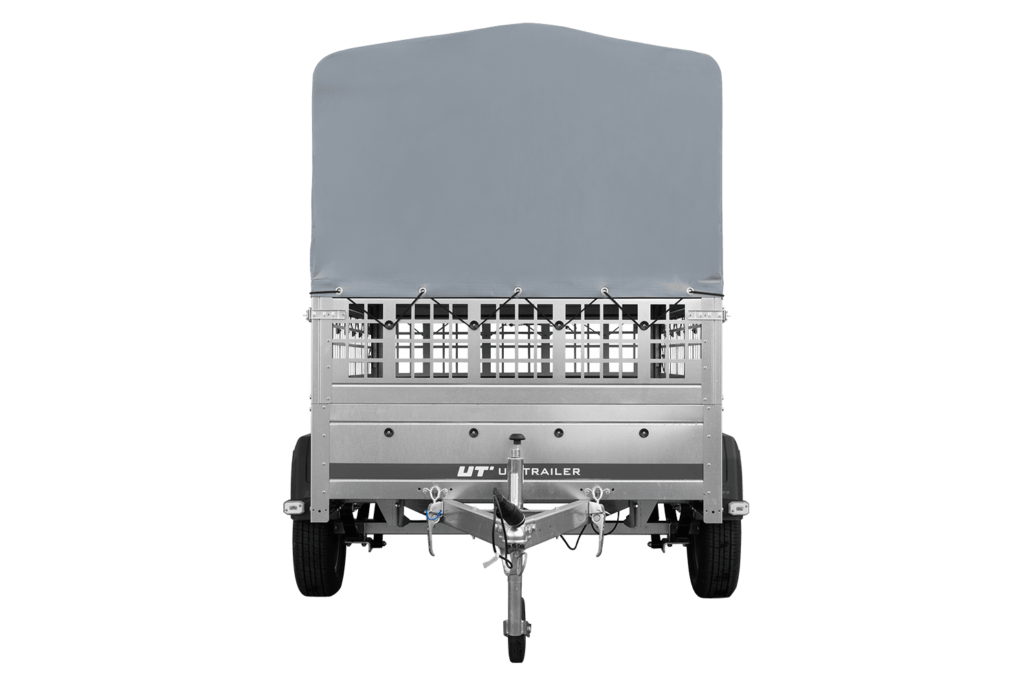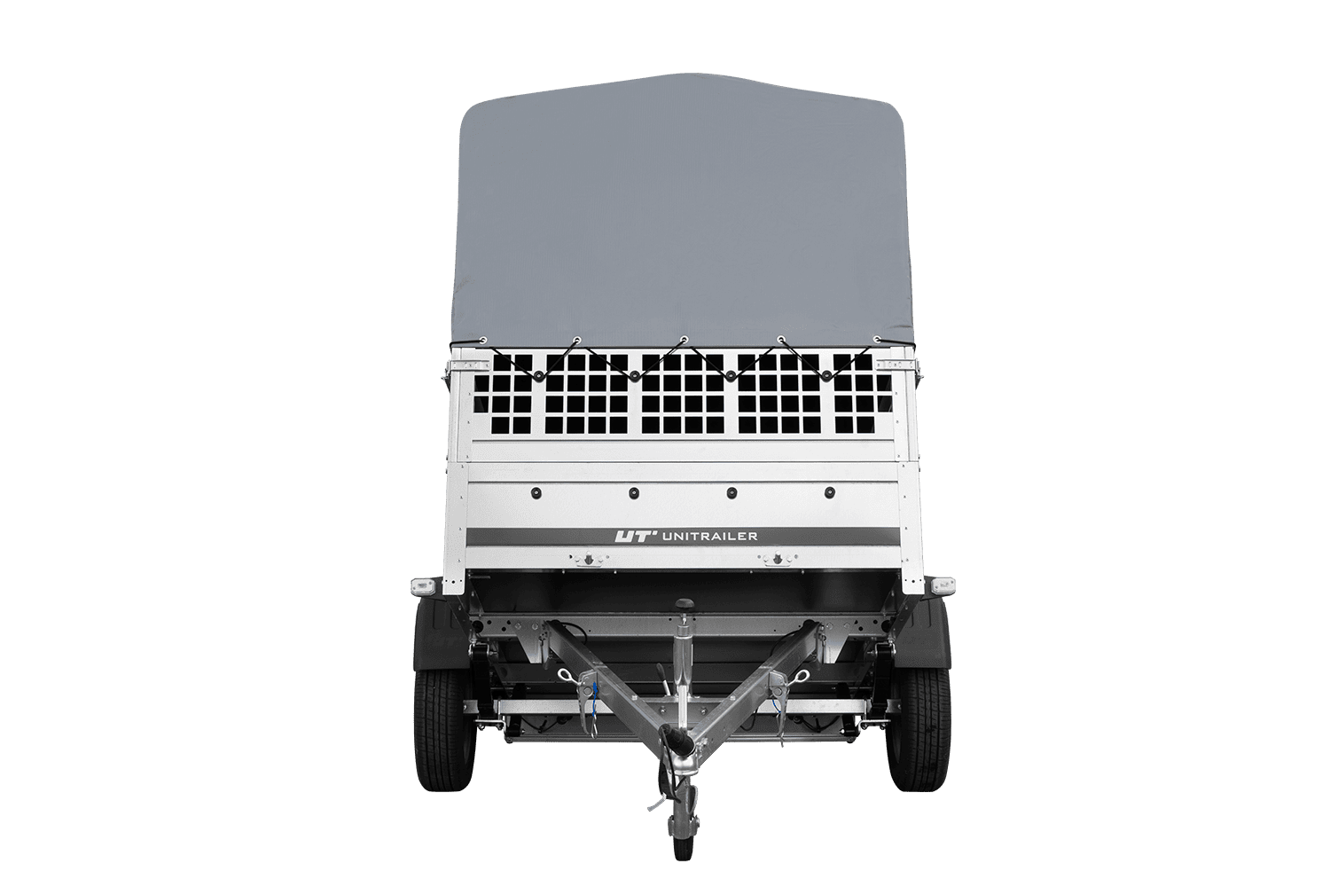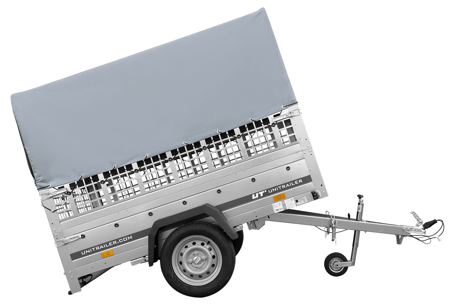 Einachsanhänger auf Federn 200x125 UNITRAILER GARDEN 201/R KIPP mit Gitterwänden, H-800-Rahmen und grauer Plane