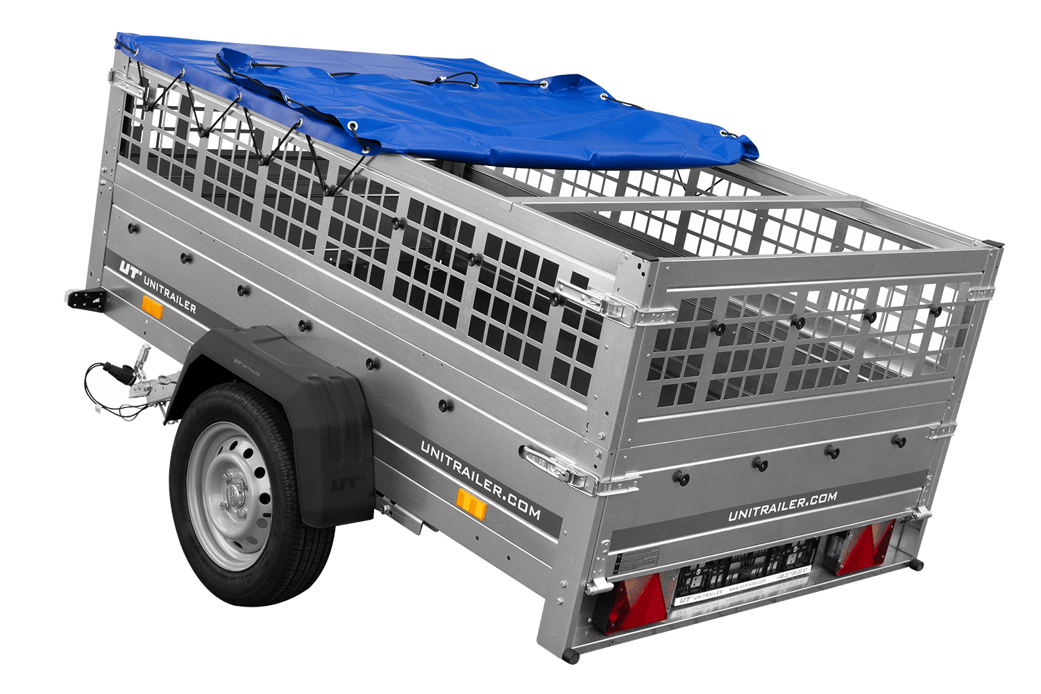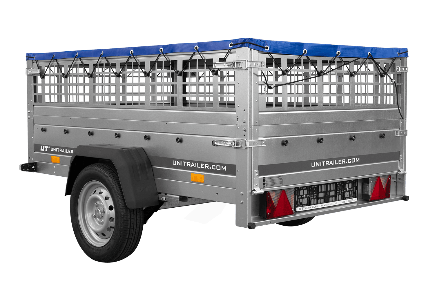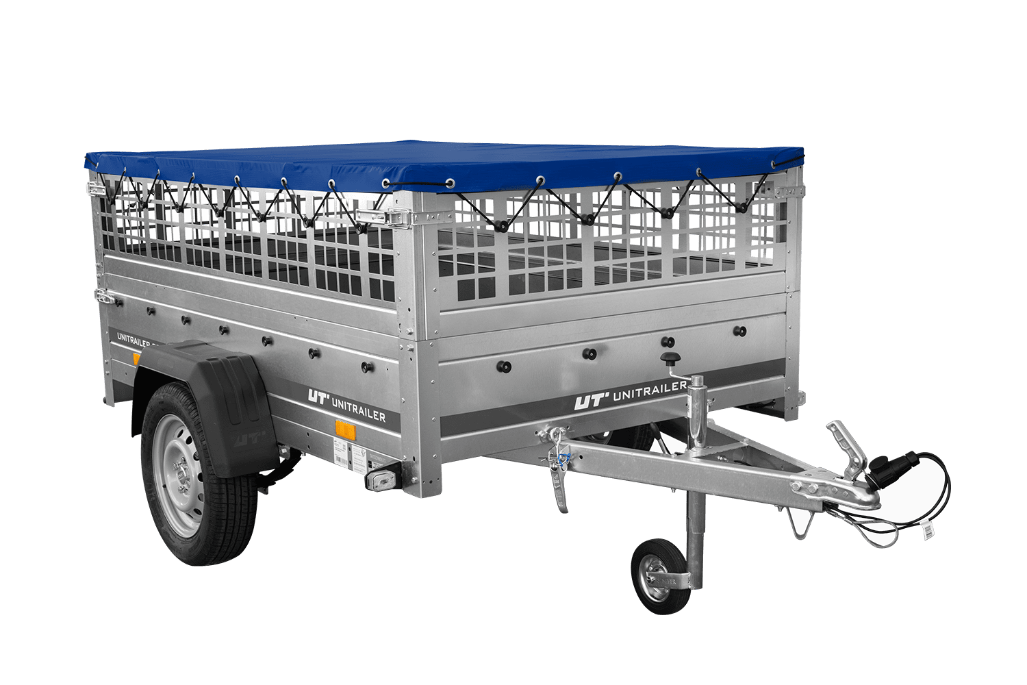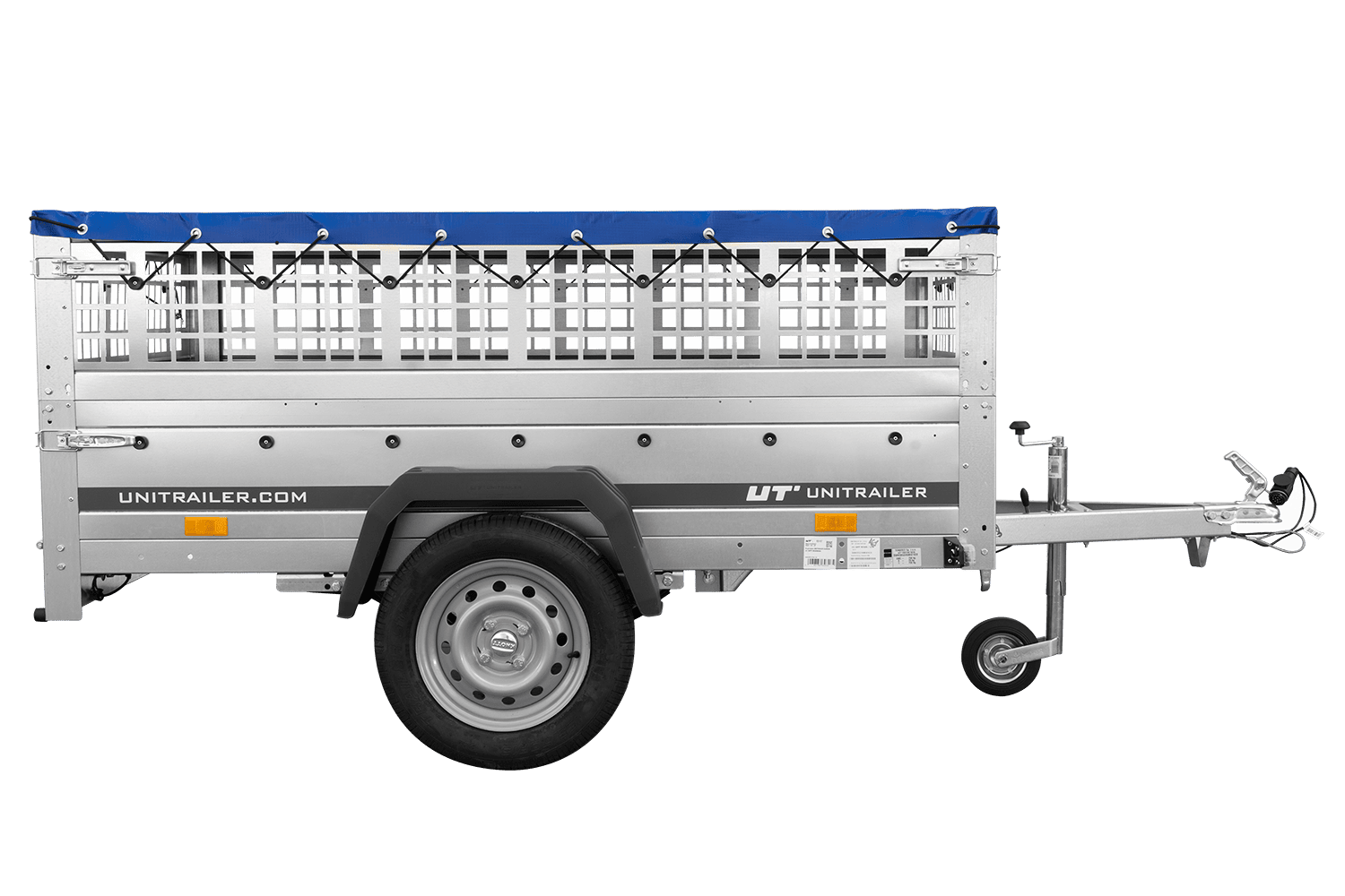 PKW-Anhänger auf Federn 200x125 UNITRAILER GARDEN 201/R KIPP mit Gitterwänden, H-0-Rahmen und blauer Plane