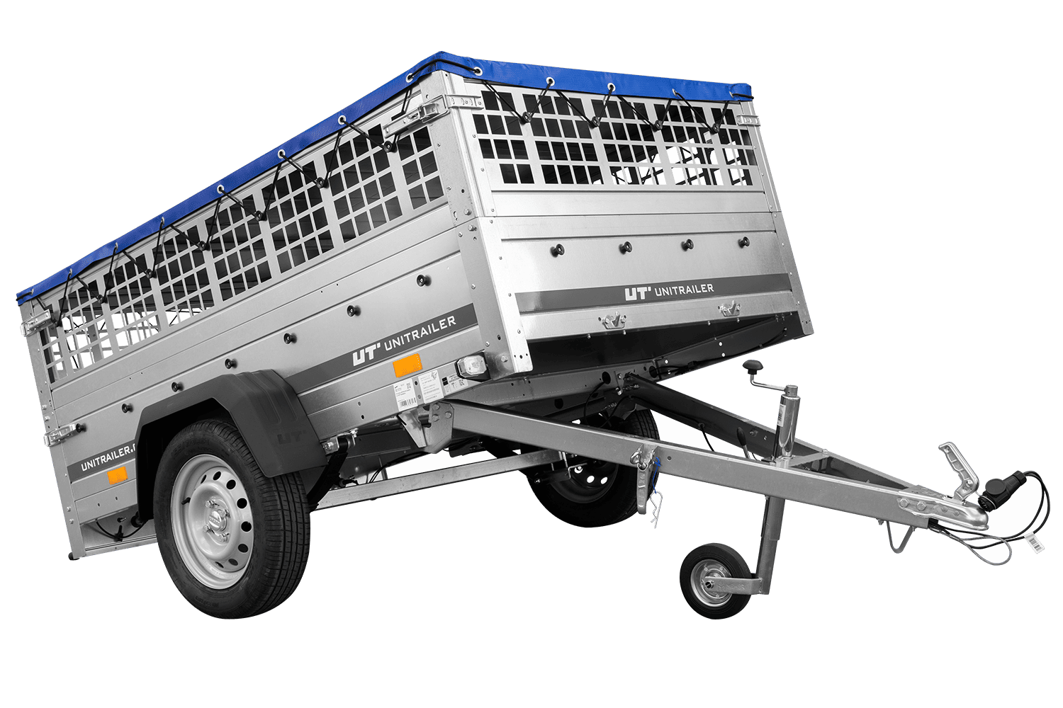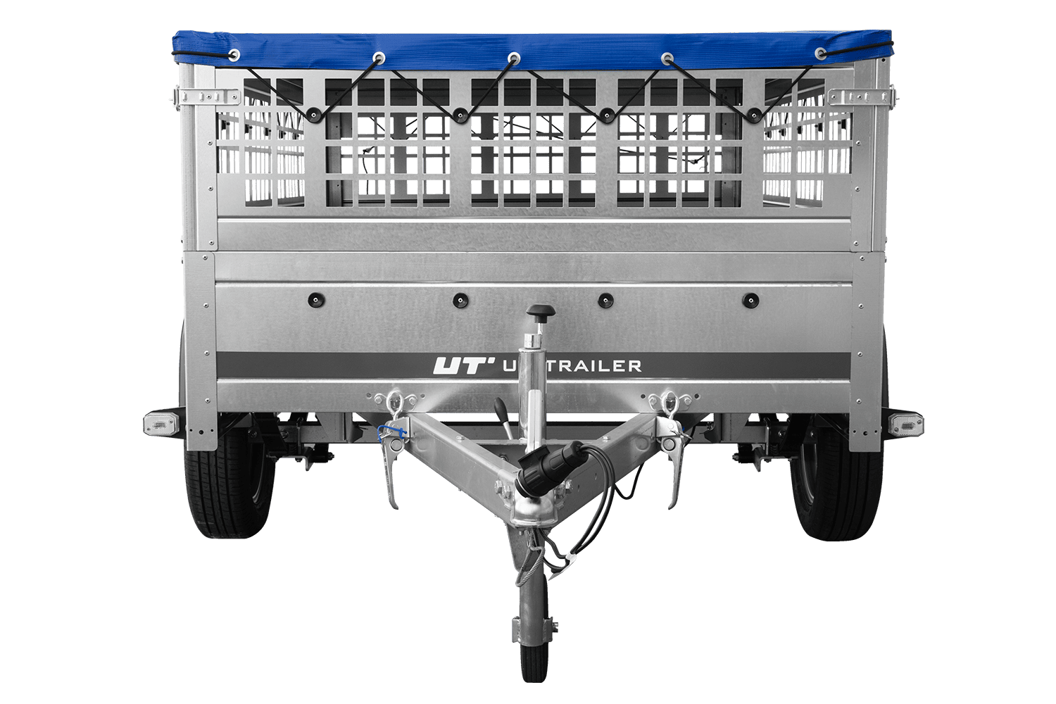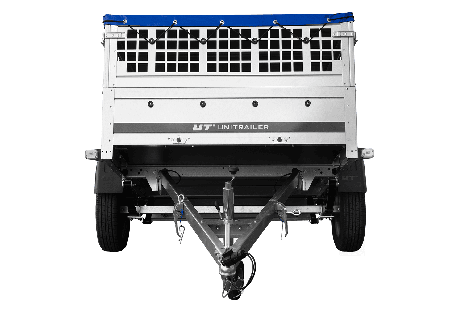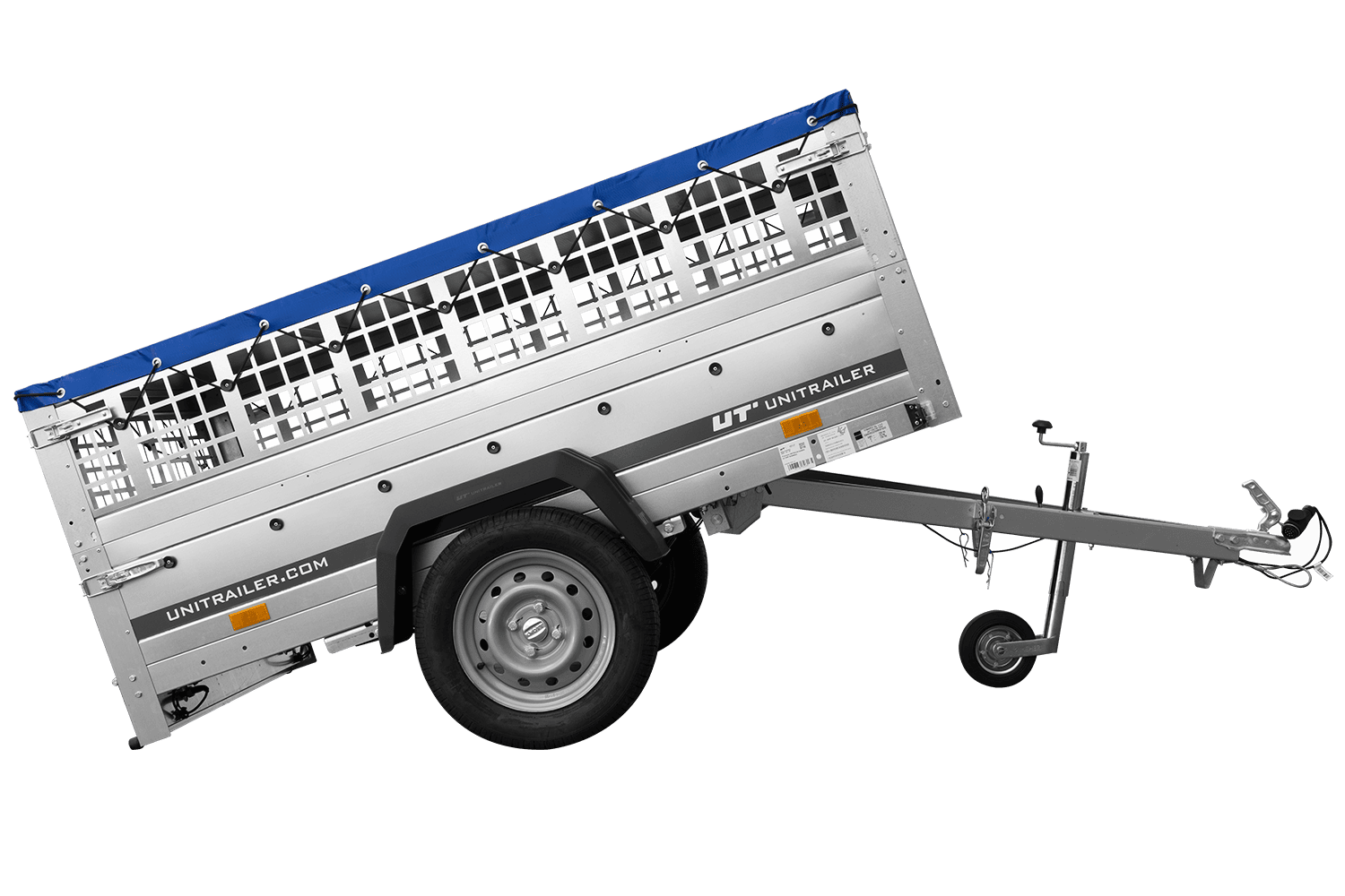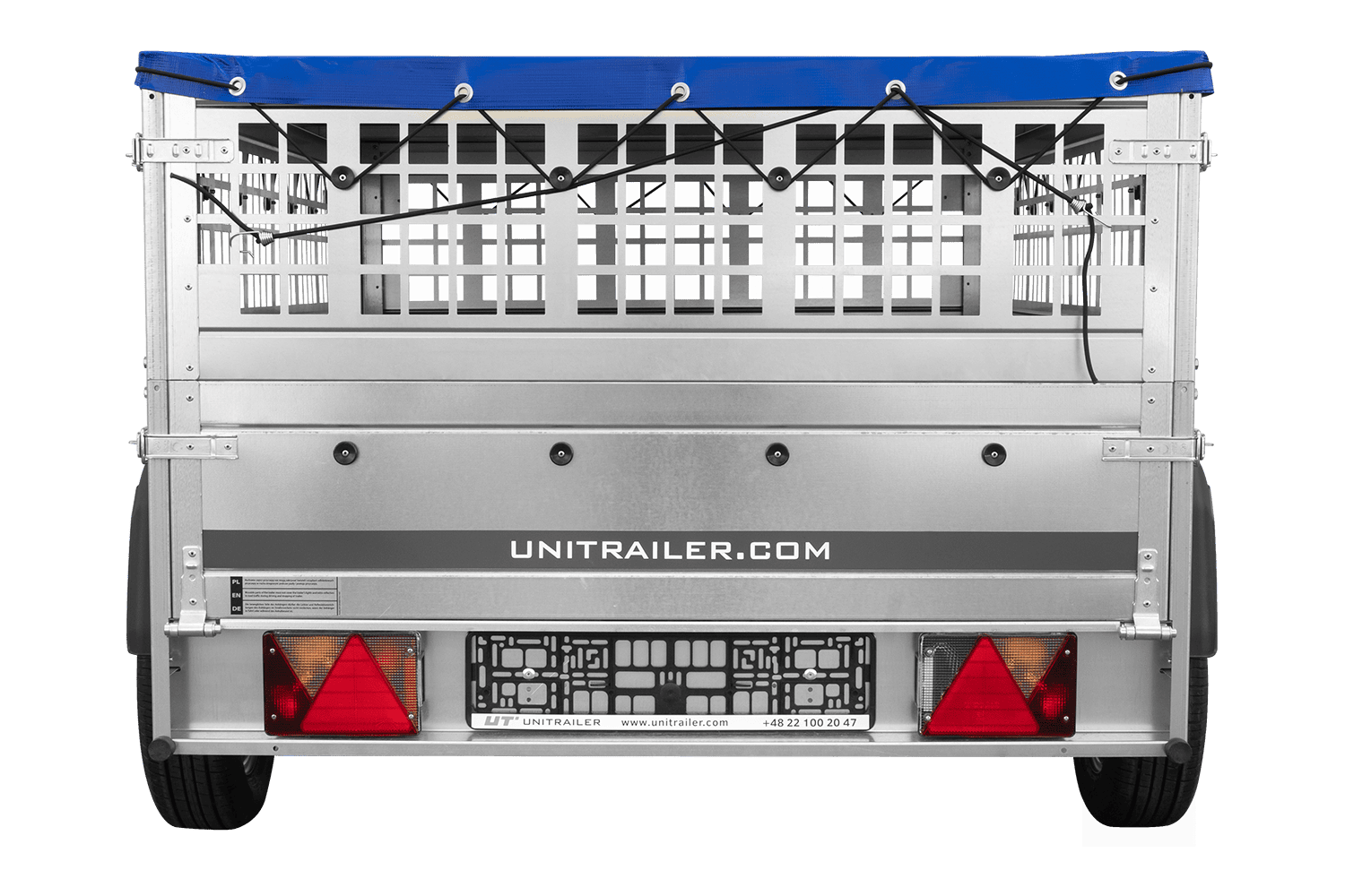 PKW-Anhänger auf Federn 200x125 UNITRAILER GARDEN 201/R KIPP mit Gitterwänden, H-0-Rahmen und blauer Plane