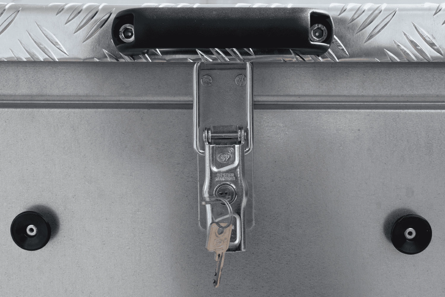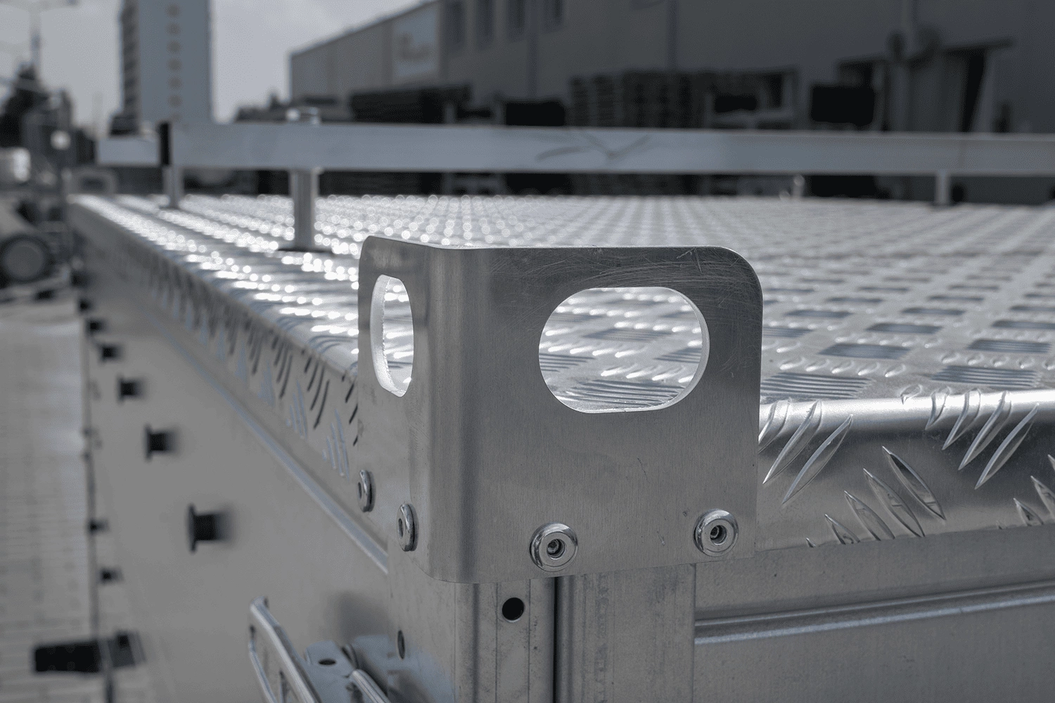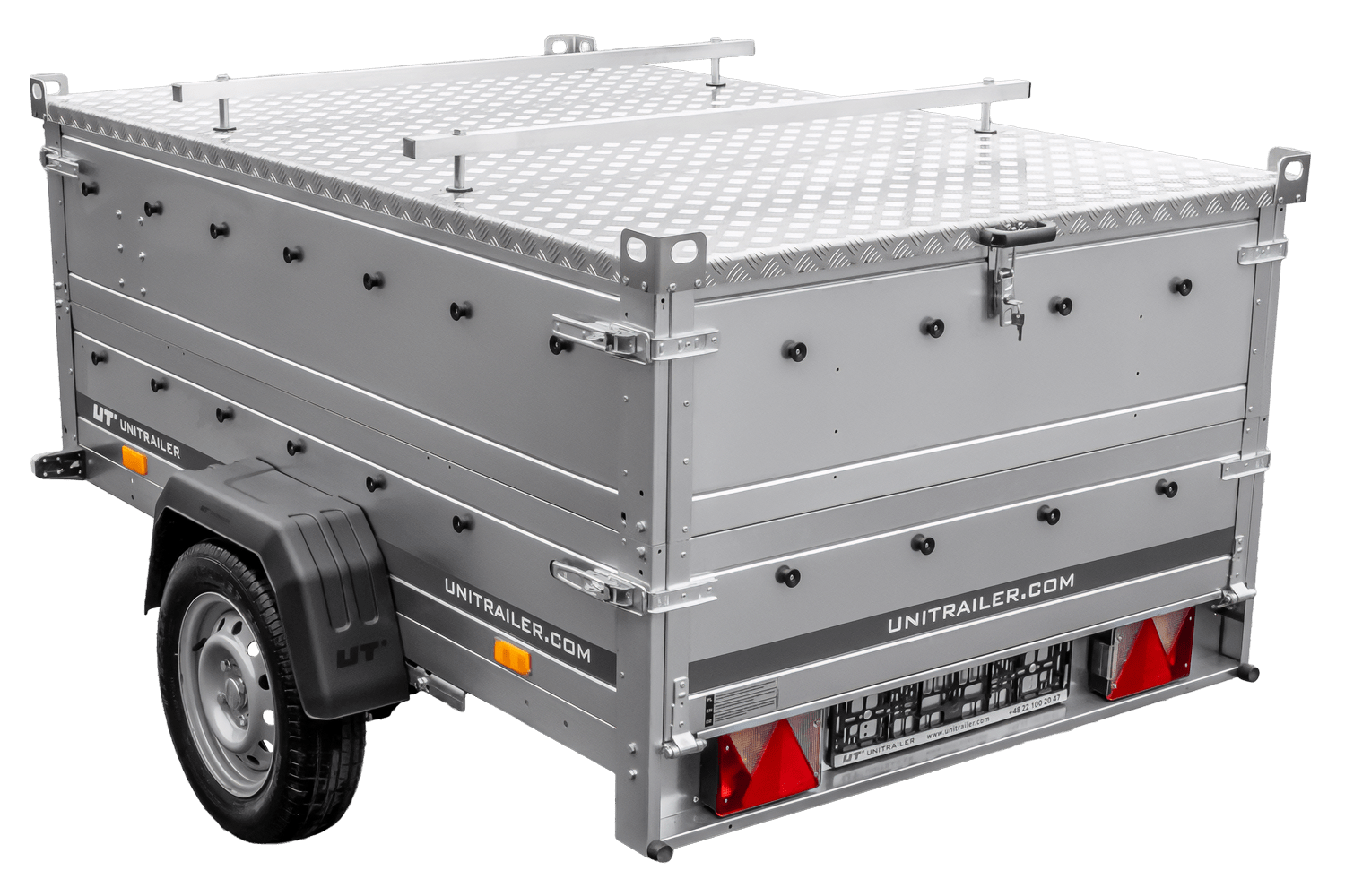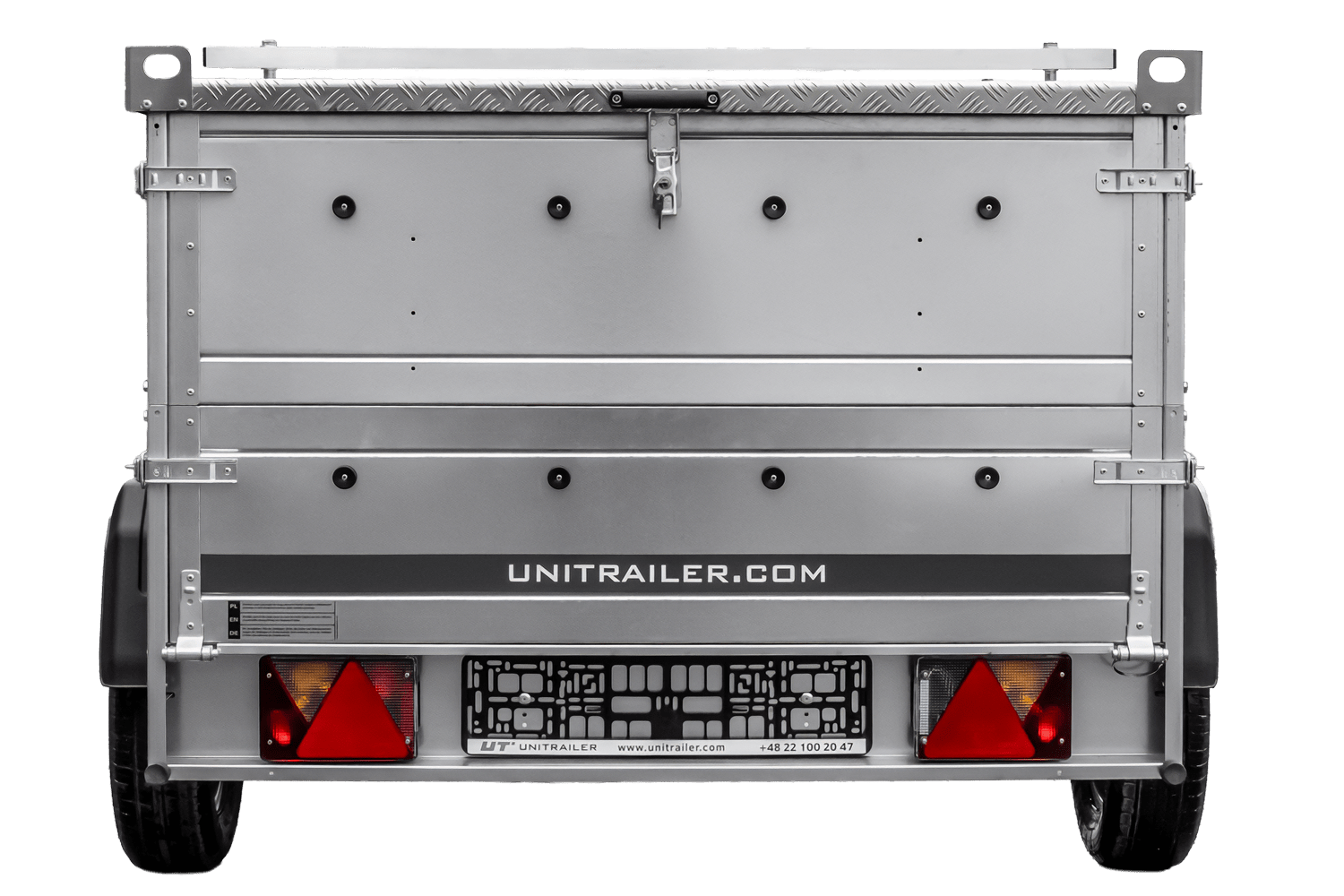 Das Kit enthält BIS-Seitenwände , die die Laderaumhöhe erhöhen und so ein größeres Ladevolumen ermöglichen. Ein weiterer Vorteil ist die Aluminiumabdeckung aus leichtem und dennoch extrem langlebigem Aluminium. Die Abdeckung ist an den Seiten verstärkt, was für strukturelle Stabilität sorgt, und beeinträchtigt dank ihres geringen Gewichts (ca. 50 kg) nicht die Ladekapazität des Anhängers. Die Aluminiumabdeckung ist mit Gasdruckfedern ausgestattet, die ein einfaches und sanftes Öffnen und Schließen ohne Kraftaufwand ermöglichen. Sie halten die Abdeckung in der geöffneten Position und vereinfachen so das Be- und Entladen erheblich. Die Abdeckung verfügt außerdem über ein Schlüsselschloss , um die Ladung vor Diebstahl zu schützen. Die Oberseite verfügt über Transportschienen , an denen ein zusätzlicher Dachgepäckträger, eine Box oder ein Fahrradträger angebracht werden kann, wodurch die Funktionalität des Anhängers erhöht und noch mehr Ladekapazität geschaffen wird.