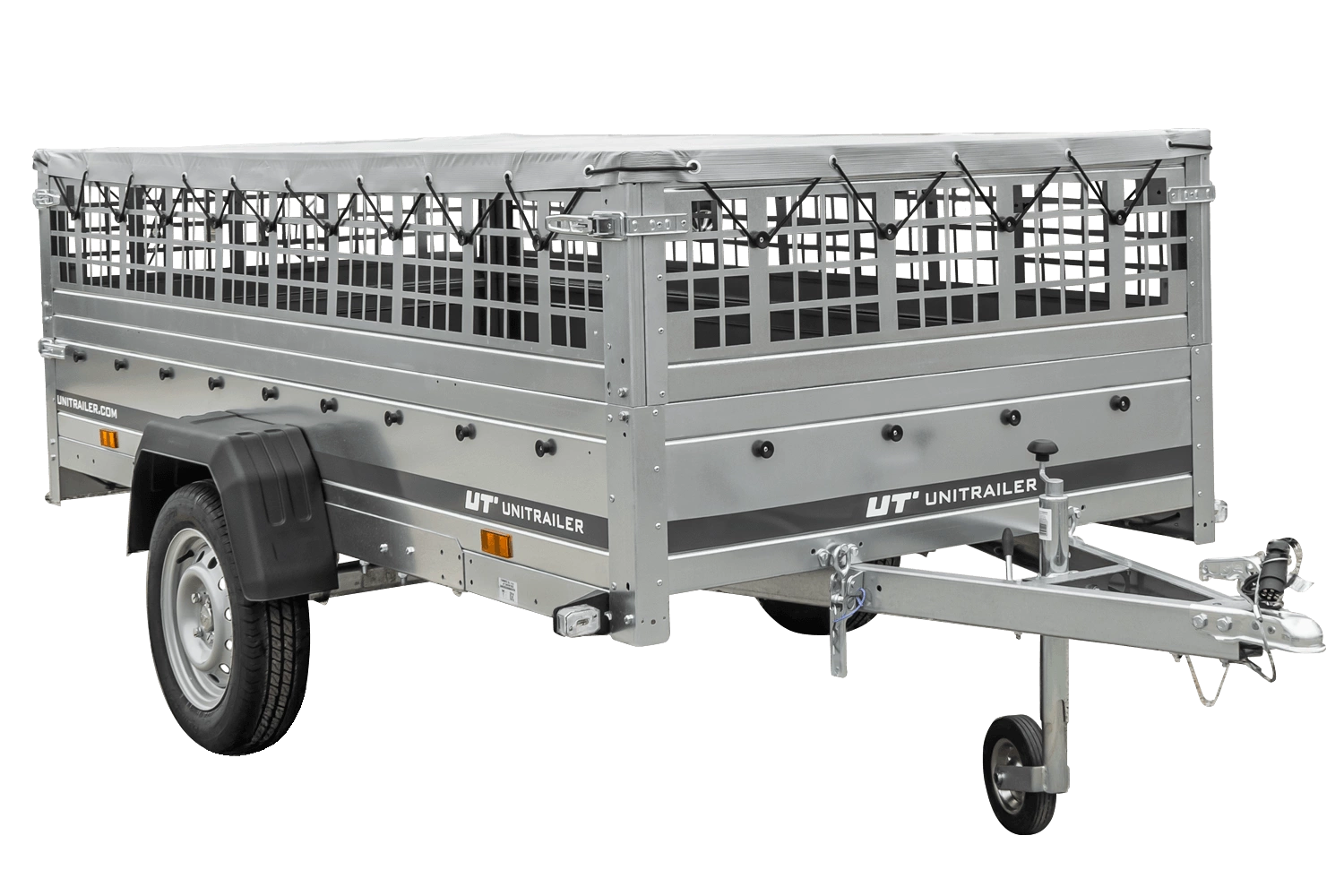 Einachsiger Anhänger auf Blattfedern 264x125 UNITRAILER GARDEN 264/R KIPP mit Gitterseitenwänden, H-0-Rahmen und grauer Plane