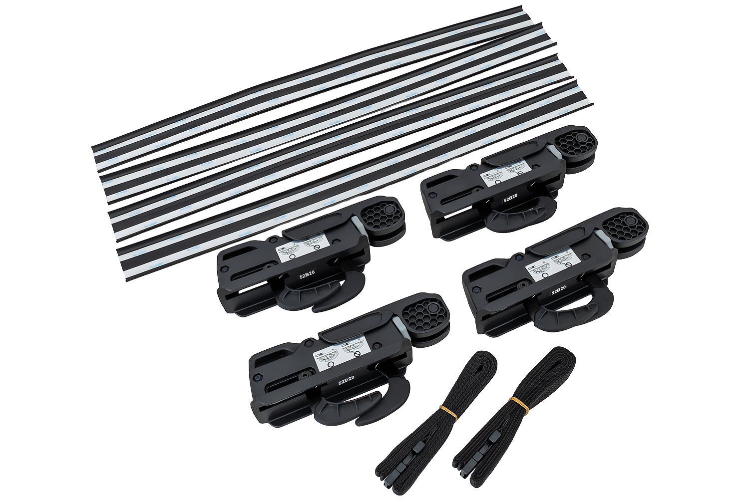 Ein kompletter Satz Befestigungsmaterial für Inter Pack Dachboxen aus der Skugga-Produktlinie.