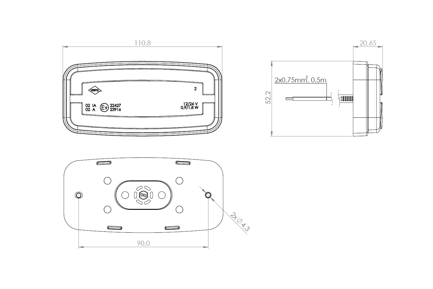 Die LED-Positionsleuchte LD 2761 von HORPOL ist für die Montage links und rechts am Fahrzeug geeignet und misst 110,8 mm in der Breite, 52,2 mm in der Höhe und 20,65 mm in der Tiefe . Sie ist für einen Spannungsbereich von 12–24 V ausgelegt und somit vielseitig einsetzbar, beispielsweise an Anhängern, Landmaschinen, Lkw und Abschleppwagen. Dank des 0,5 m langen Flachkabels ist die Installation schnell und einfach. Die LED-Technologie sorgt für hohe Leistung, Langlebigkeit und Energieeffizienz und gewährleistet so die Sicherheit unter verschiedenen Verkehrsbedingungen. Das Leuchtengehäuse ermöglicht eine Montage ohne sichtbare Befestigungselemente.