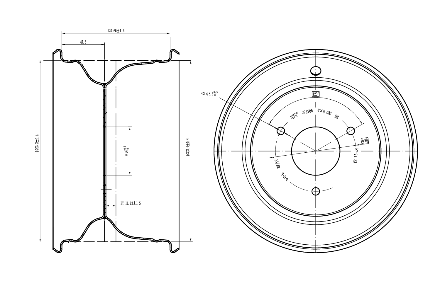 Dieses Modell verfügt über einen 3x90-Lochkreis , d. h. die Felge hat drei Befestigungslöcher, die in einem Kreis mit 90 mm Durchmesser angeordnet sind. Der Lochkreis ist ein wichtiger Parameter bei der Felgenauswahl, um die korrekte Passform an der Fahrzeugnabe zu gewährleisten.