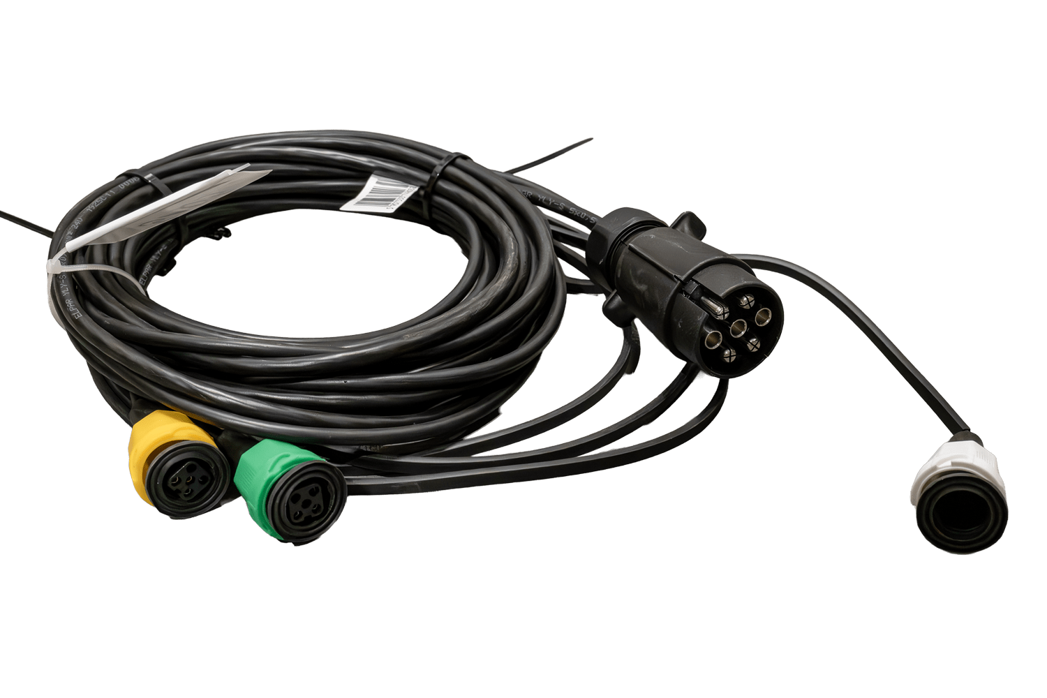 - Das elektrische System MANTES OUTLET verfügt über ein 4,7 Meter langes Hauptkabel mit einem 7-poligen Stecker. Der Kabelbaum gewährleistet den einwandfreien Betrieb der Anhängerbeleuchtung, während AJ.BA 5-polige und 2-polige Bajonettstecker eine schnelle