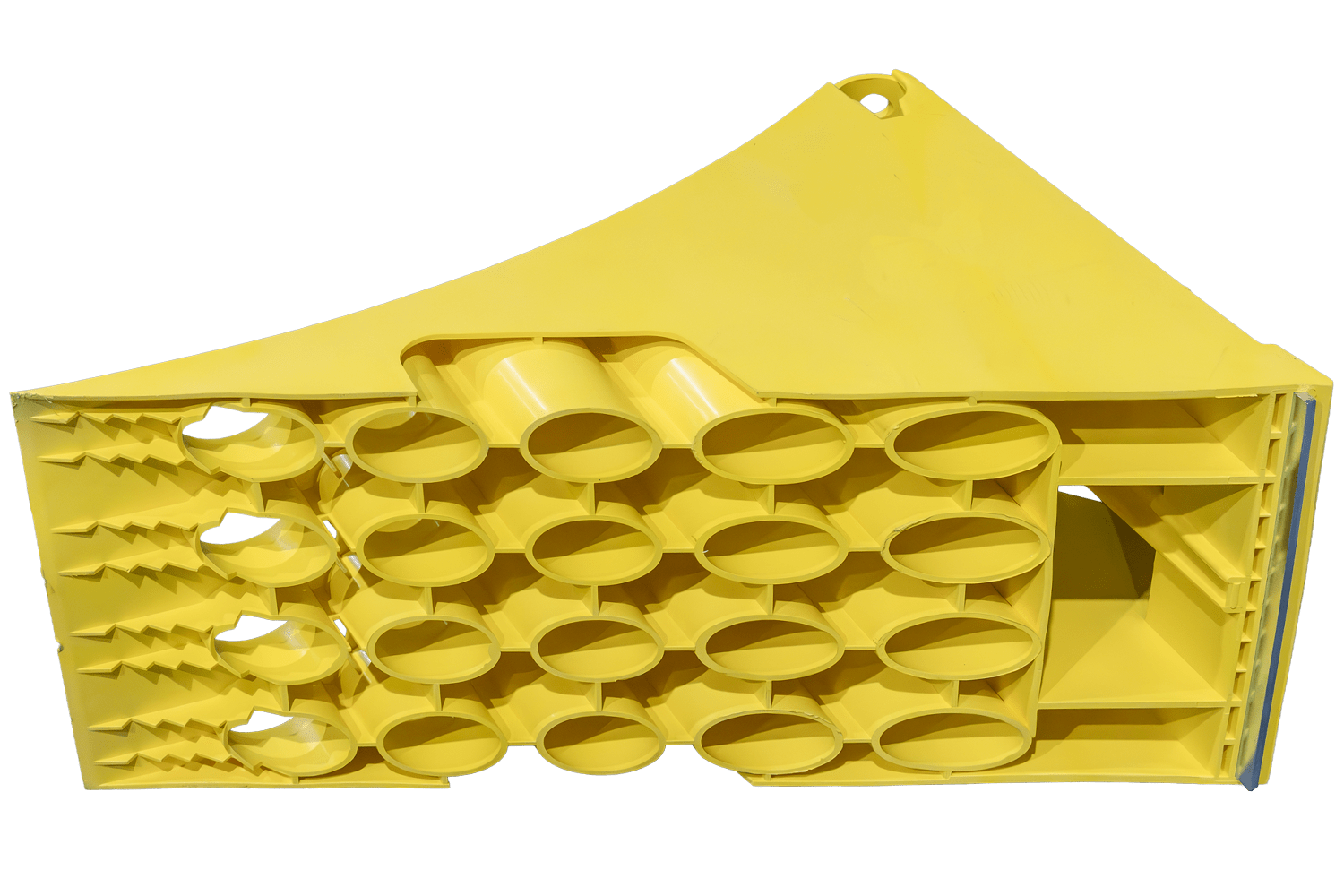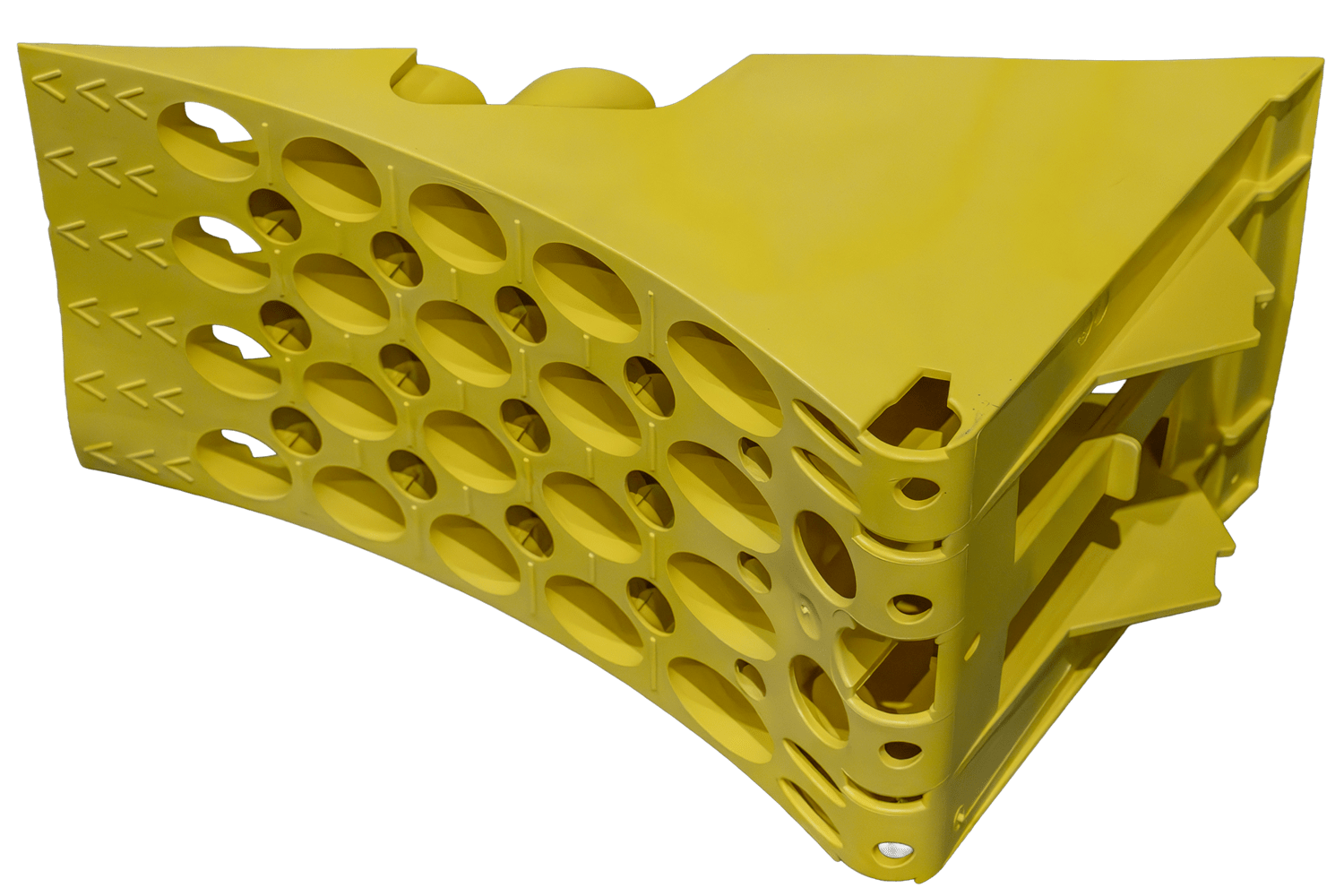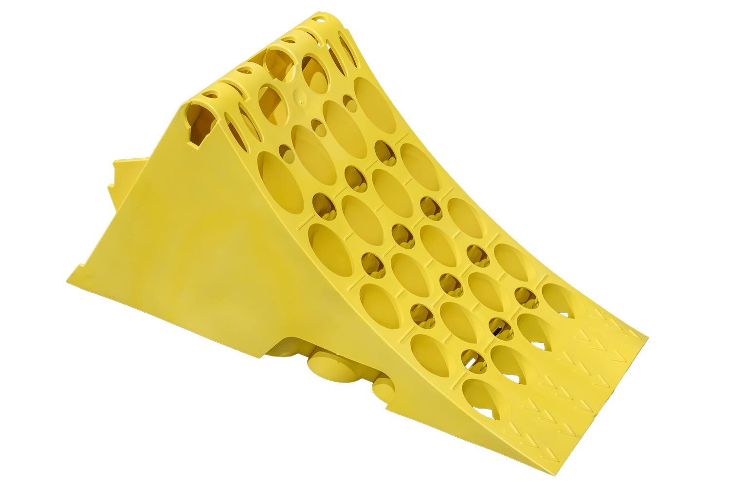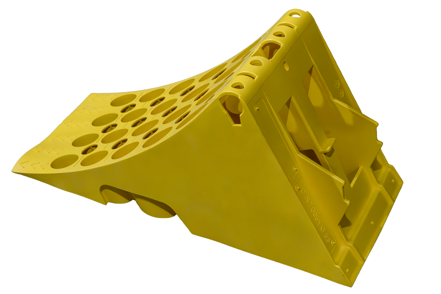 Der aus robustem und dennoch leichtem Kunststoff gefertigte Keil ist deutlich leichter als herkömmliche Metallkeile und daher einfacher zu handhaben und zu transportieren. Eine integrierte Stahlverstärkungsplatte an der Unterseite verhindert ein Verrutschen des Keils während des Gebrauchs und erhöht so seine Wirksamkeit und Sicherheit. Das Produkt erfüllt die Anforderungen der DIN 76051-1 (11/1992) , welche die technischen Normen für Keile in Nutzfahrzeugen festlegt. Dank seiner robusten Konstruktion und des optimierten Profils gewährleistet der Keil eine zuverlässige Fahrzeugfixierung auch in schwierigem Gelände.