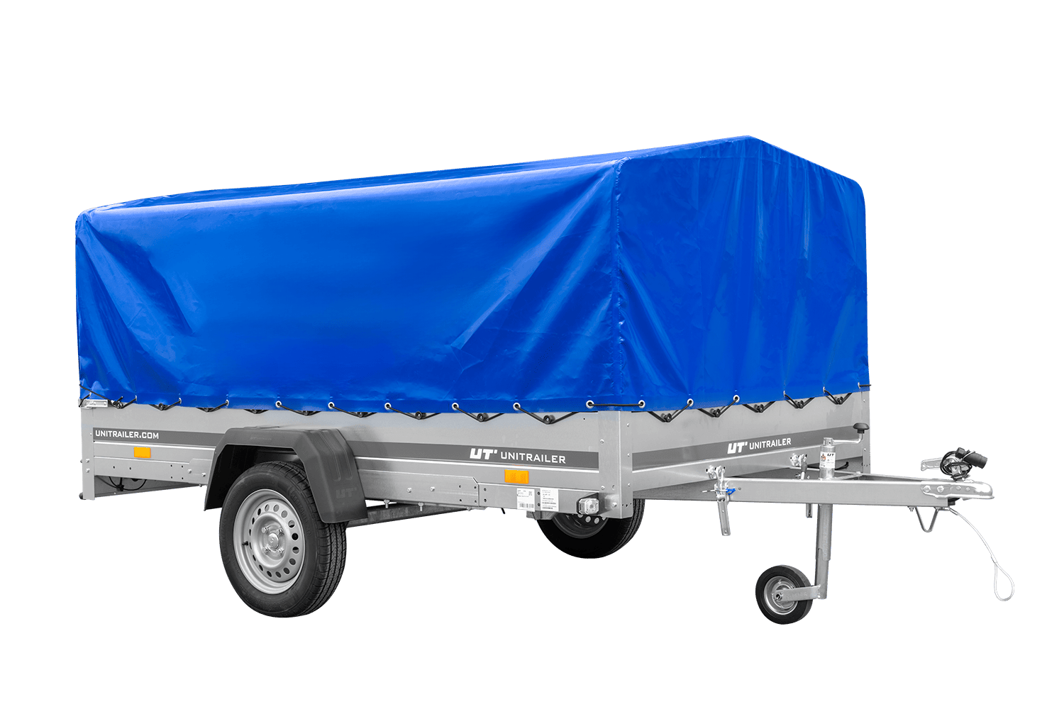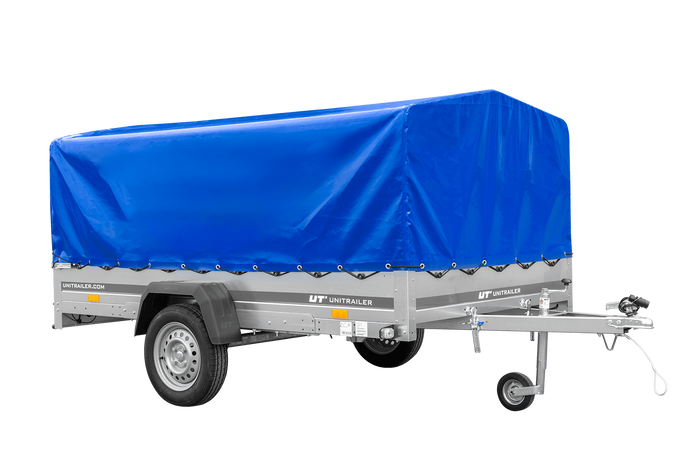 Einachsiger Anhänger auf Blattfedern 264x150 UNITRAILER GARDEN 265/R KIPP mit H-800 Rahmen und blauer Plane