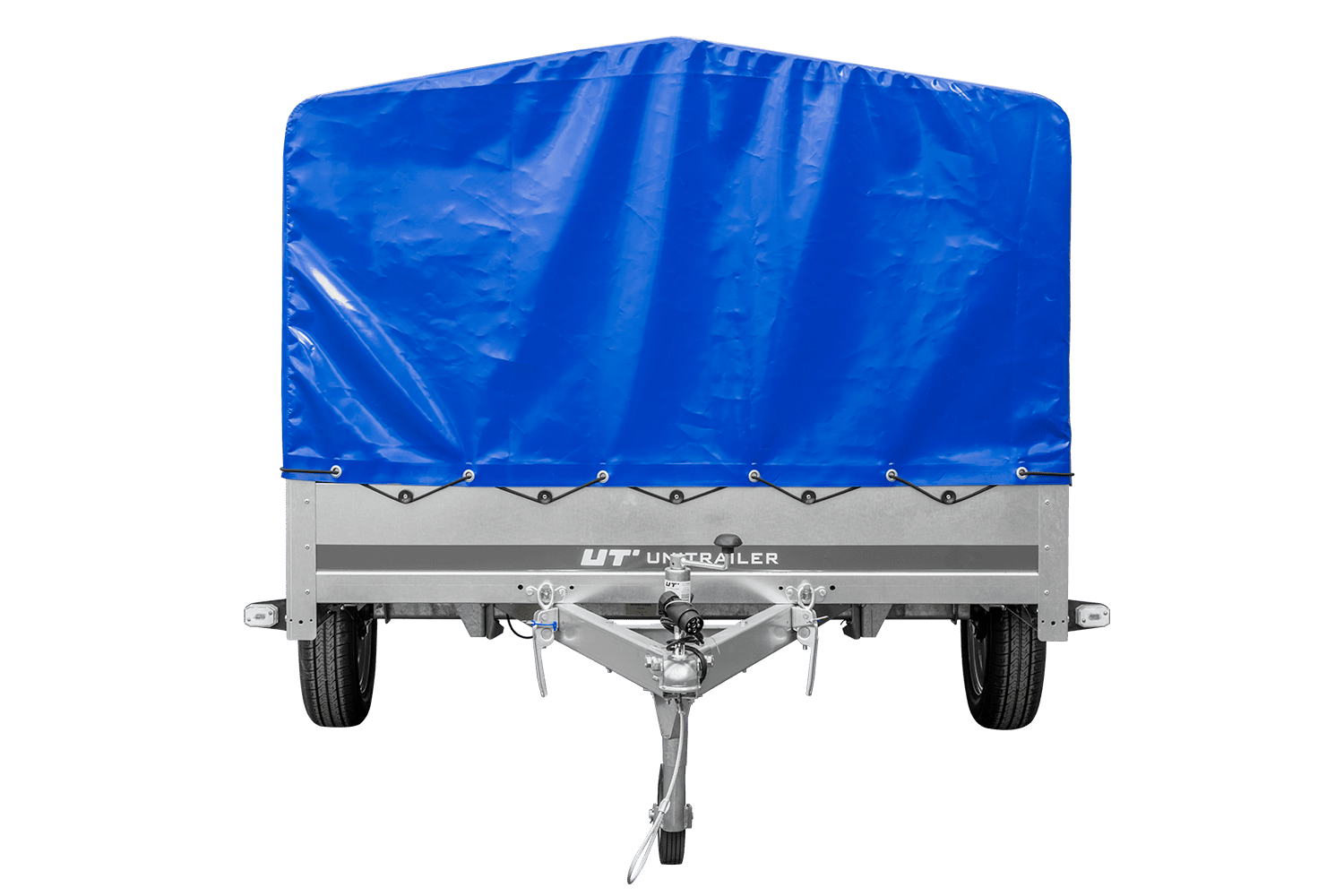 Autotransportanhänger auf Federn mit H-800-Rahmen und blauer Plane