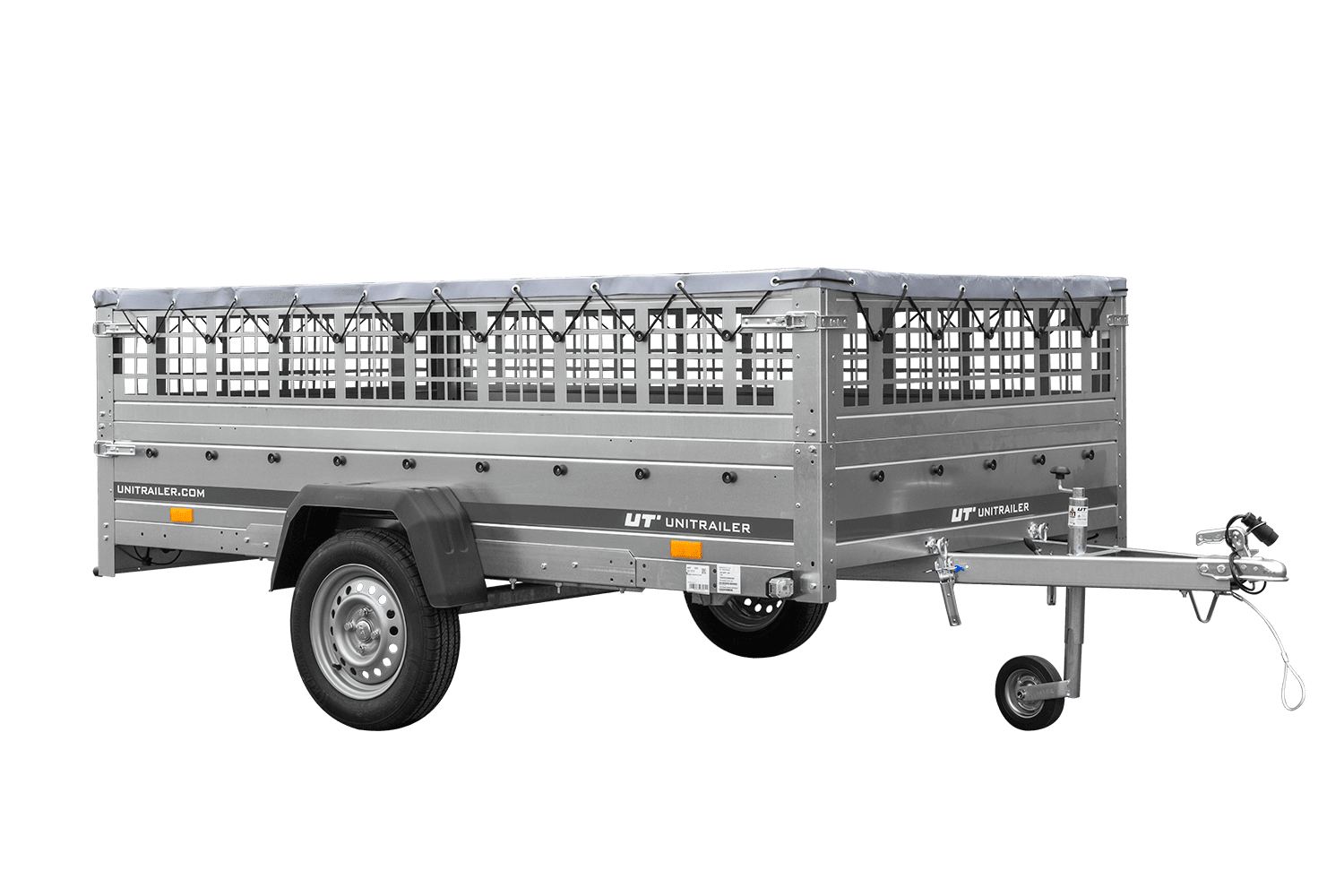 Leichter Anhänger auf Blattfedern 264x150 UNITRAILER GARDEN 265/R KIPP mit Gitterwänden, H-0 Rahmen und grauer Plane