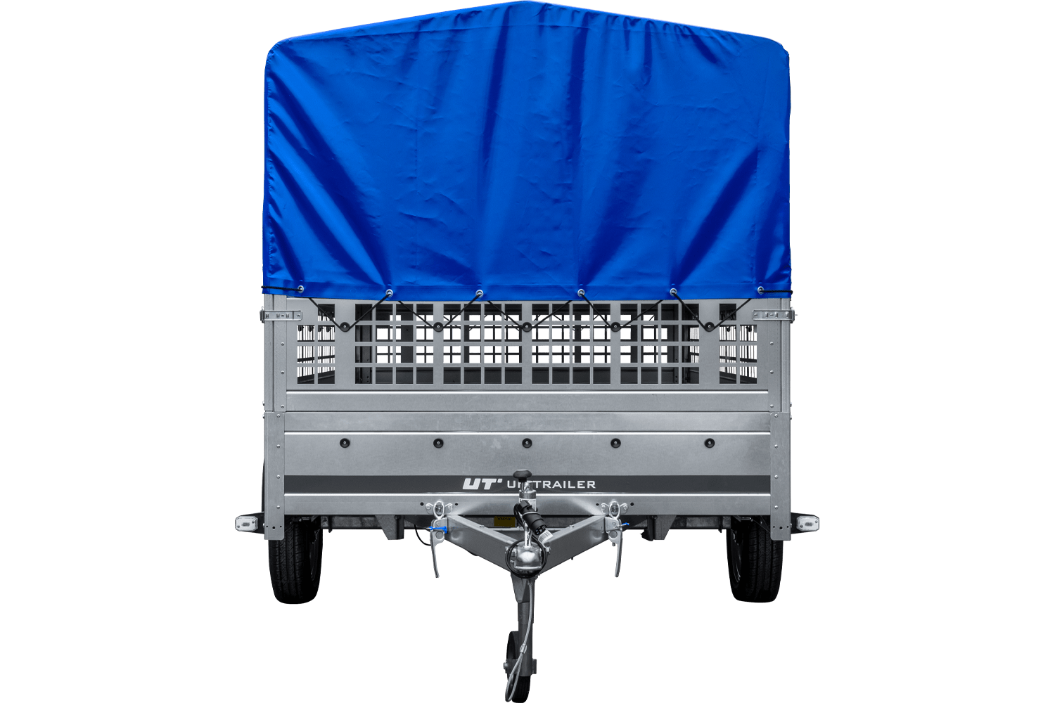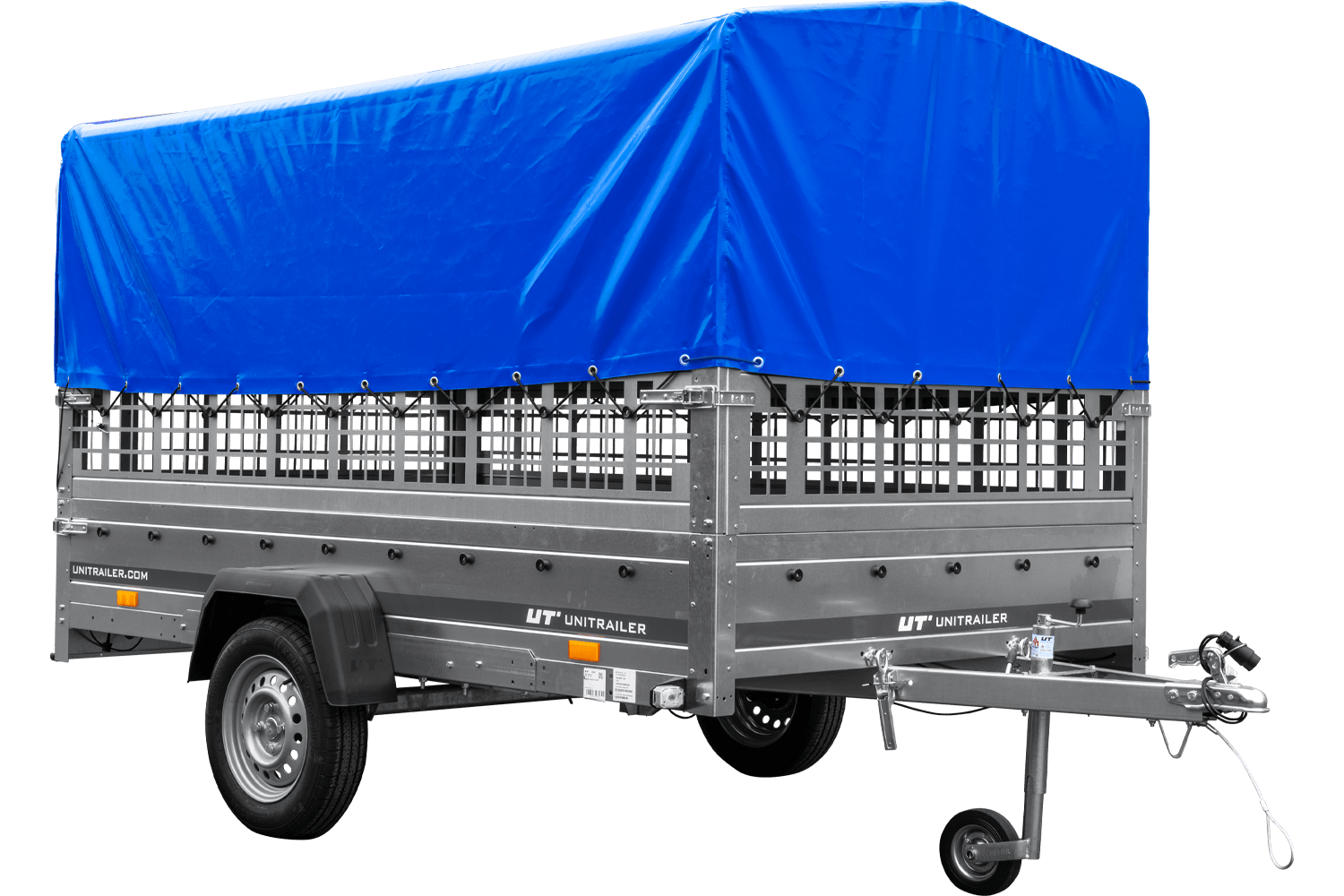 - Der UNITRAILER GARDEN 265/R KIPP mit Blattfedern und Stoßdämpfern, komplett mit Seitenwänden aus Netzgewebe, H-800-Rahmen und blauer Abdeckung. Bietet viel Stauraum und verbesserten Schutz der Ladung vor widrigen Witterungsbedingungen.