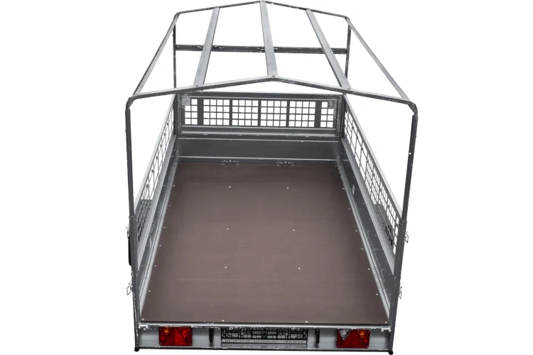 Der verzinkte Stahlrahmen und die Seitenwände sind korrosionsbeständig und halten starker Beanspruchung stand. Der wasserdichte, 9 mm starke Sperrholzboden mit rutschfester Beschichtung erhöht die Transportsicherheit unter verschiedensten Bedingungen, während Verstärkungen unter dem Boden die Konstruktion auch bei höheren Lasten stabilisieren. Die zu öffnende Rückseite erleichtert das Be- und Entladen, und ihre abnehmbare Konstruktion ermöglicht den Transport längerer Gegenstände.