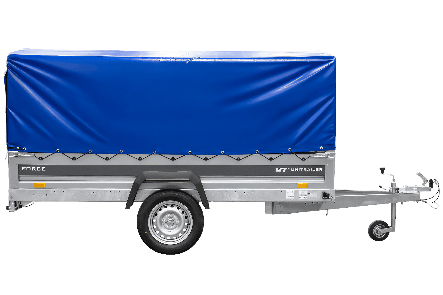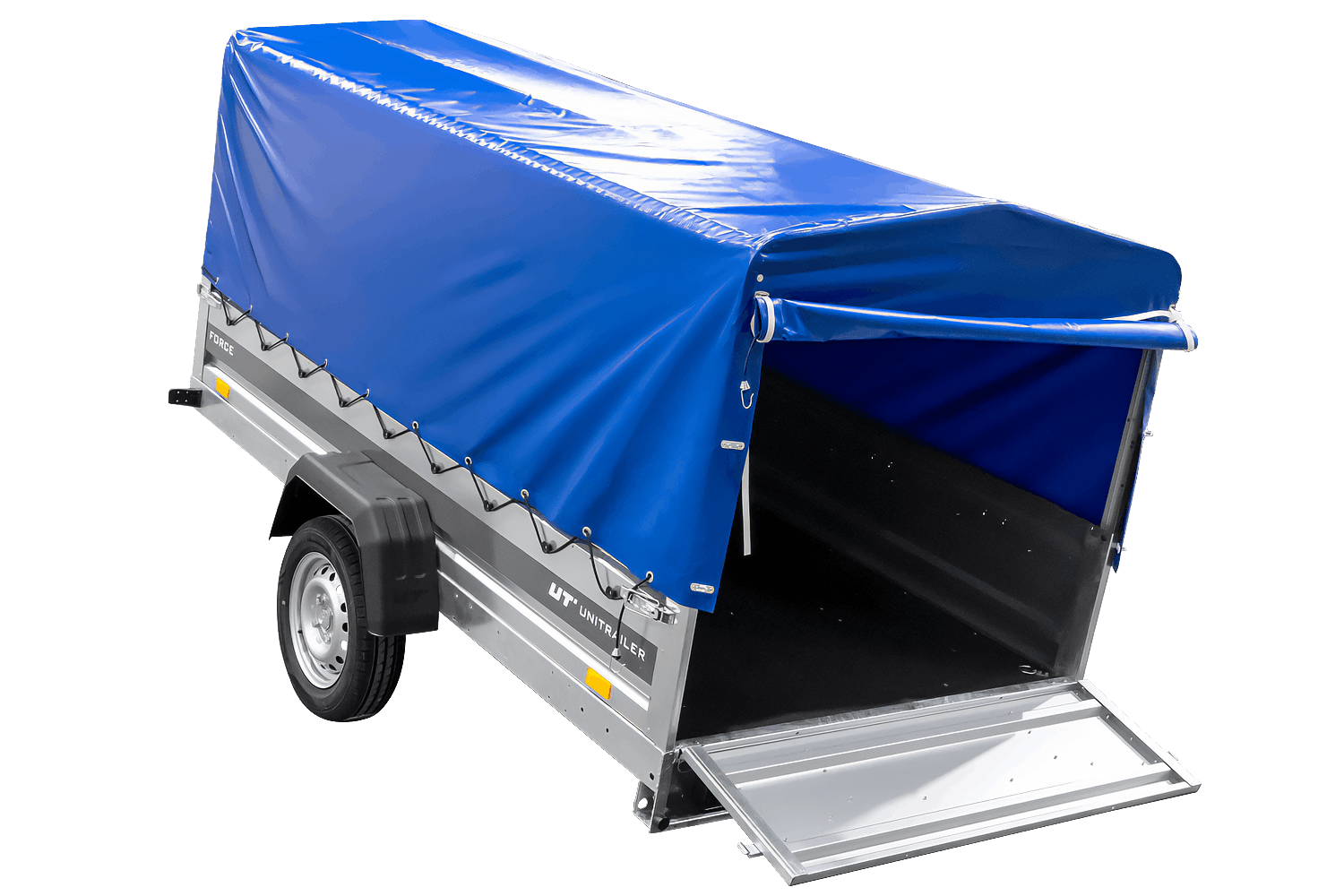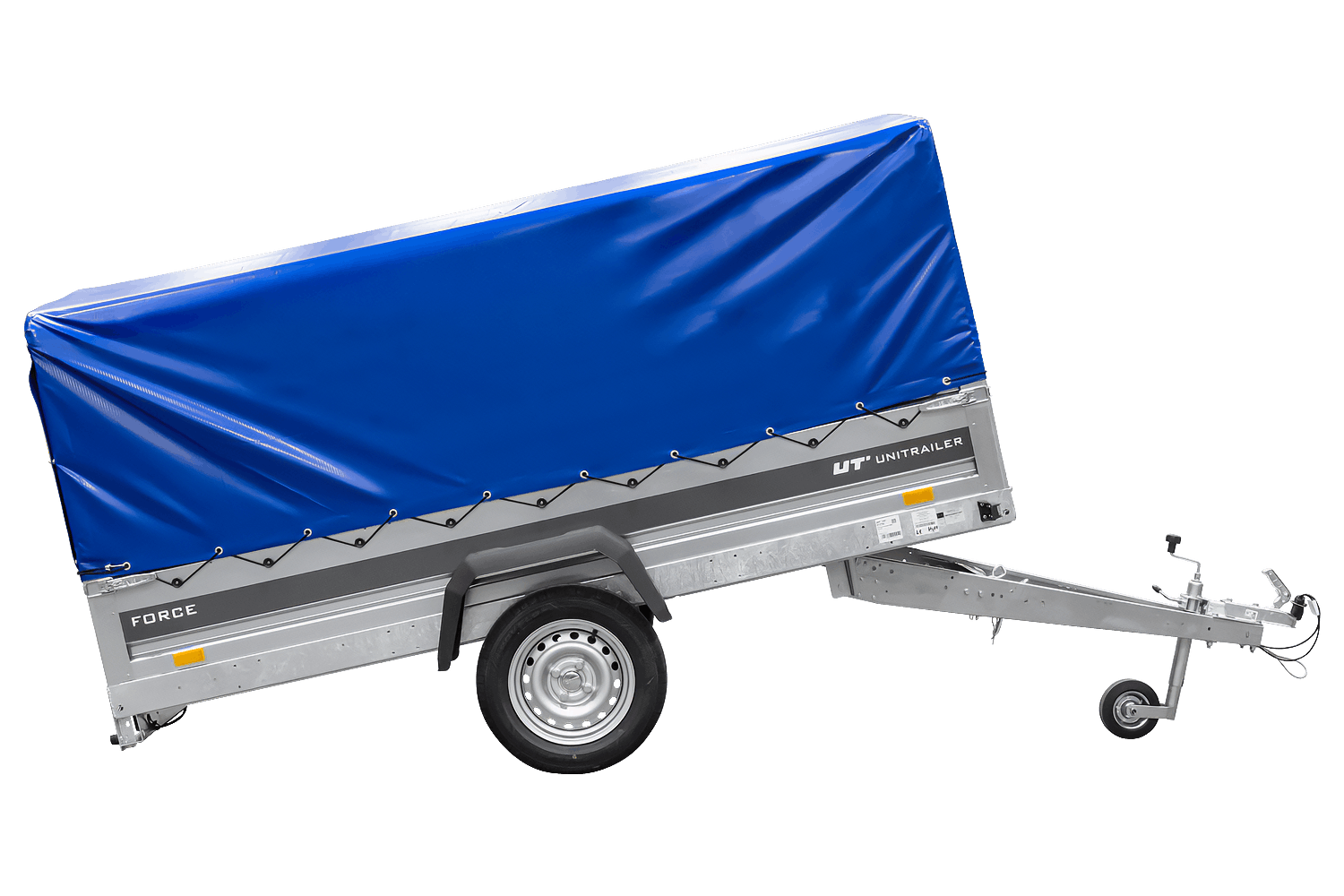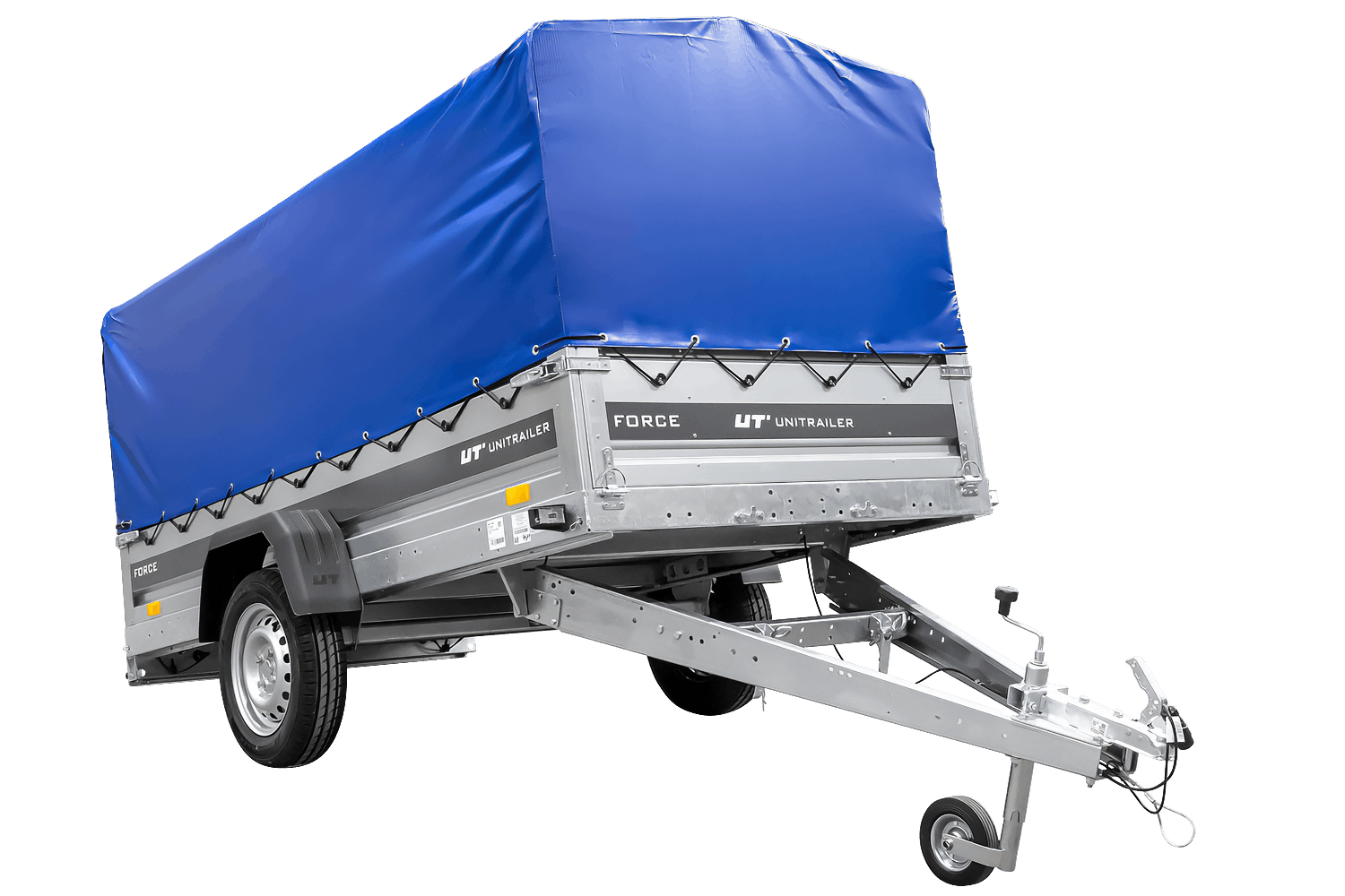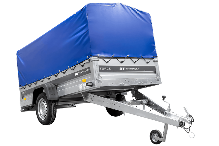 - Der UNITRAILER FORCE 264 KIPP Anhänger verfügt über einen H-800-Rahmen und eine blaue Plane. Die vergrößerte Ladefläche und die robuste Schweißkonstruktion gewährleisten eine komfortable Nutzung.