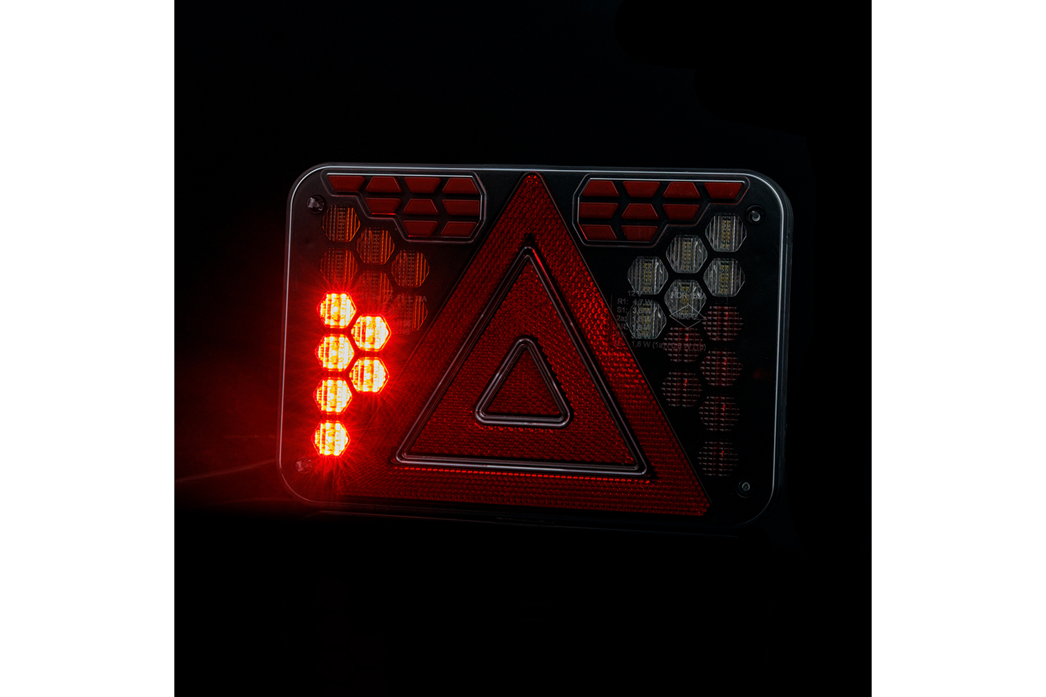 KennzeichenbeleuchtungDie Lampe hat sieben Funktionen: ein Neon-Positionslicht , das die Sichtbarkeit des Fahrzeugs bei Nachtfahrten gewährleistet; einen Blinker , mit dem Sie Ihre Abbiegeabsicht anzeigen können ; ein Bremslicht , das das Bremsen signalisiert; ein Rückfahrlicht , das das Rückwärtsfahren durch bessere Sicht hinter dem Fahrzeug erleichtert ; ein Nebelscheinwerfer , der die Sicherheit bei schwierigen Wetterbedingungen wie Nebel oder starkem Regen erhöht; ein dreidimensionales reflektierendes Dreieck , das die Sichtbarkeit des Fahrzeugs erhöht; und eine Kennzeichenbeleuchtung , die sicherstellt, dass die Fahrzeugregistrierungsnummer nachts sichtbar ist .
