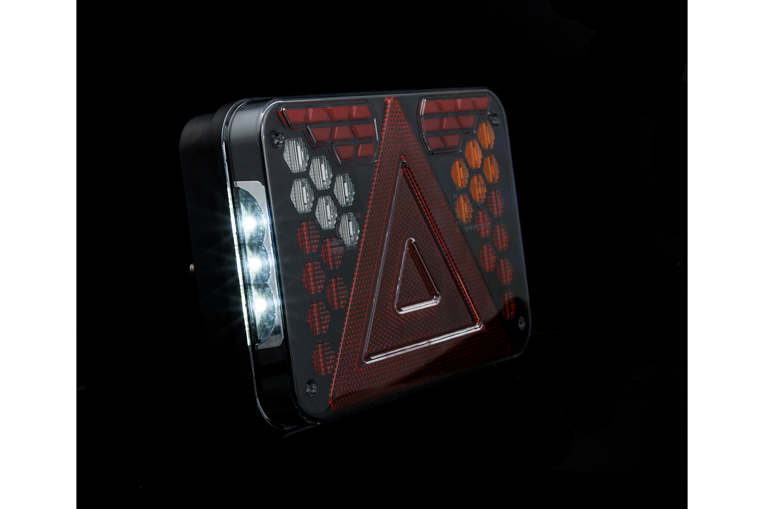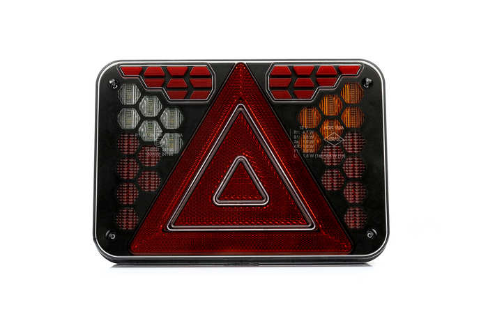 Die Lampe hat sieben Funktionen: ein Neon-Positionslicht , das die Sichtbarkeit des Fahrzeugs bei Nachtfahrten gewährleistet; einen Blinker , mit dem Sie Ihre Abbiegeabsicht anzeigen können ; ein Bremslicht , das das Bremsen signalisiert; ein Rückfahrlicht , das das Rückwärtsfahren durch bessere Sicht hinter dem Fahrzeug erleichtert ; ein Nebelscheinwerfer , der die Sicherheit bei schwierigen Wetterbedingungen wie Nebel oder starkem Regen erhöht; ein dreidimensionales reflektierendes Dreieck , das die Sichtbarkeit des Fahrzeugs erhöht; und eine Kennzeichenbeleuchtung , die sicherstellt, dass die Fahrzeugregistrierungsnummer nachts sichtbar ist .