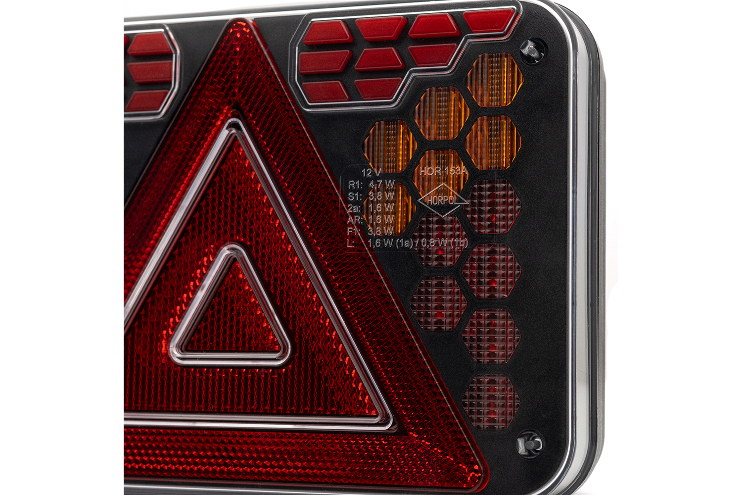 • Die LED-Rückleuchte LZD 3216 HORPOL ist für die Montage auf der rechten Fahrzeugseite vorgesehen. Sie bietet sieben Funktionen: Positionslicht, Bremslicht, Rückfahrlicht, Nebelscheinwerfer, Blinker, Kennzeichenbeleuchtung und Reflektor.