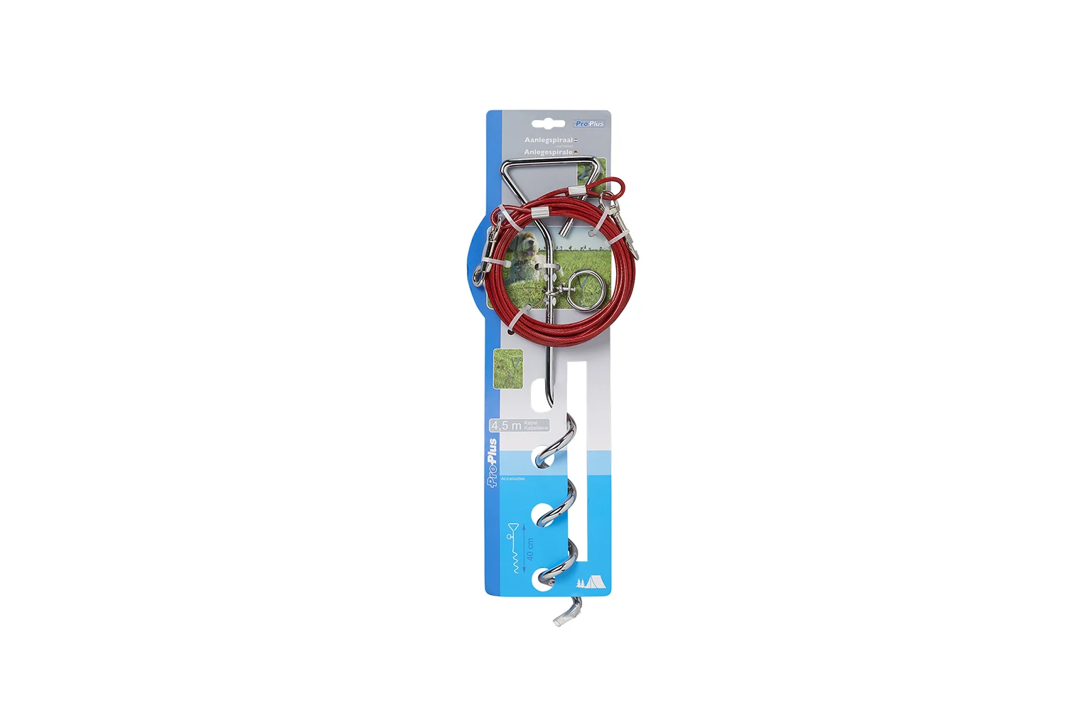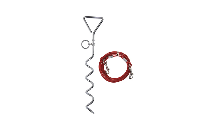 Das Set beinhaltet einen spiralförmigen Erdspieß und ein 4,5 Meter langes Stahlseil . Der Erdspieß ist aus robustem Stahl gefertigt und lässt sich dank seiner Spiralform ohne Spezialwerkzeug fest im Boden verankern. Der drehbare Ring am oberen Ende verhindert, dass sich das Seil bei Bewegungen des Hundes verheddert.