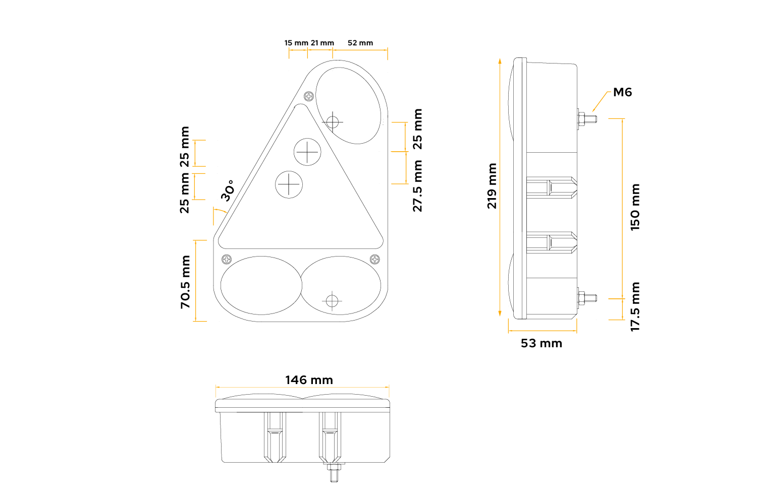 Die Earpoint III Rückleuchte von ASPÖCK ist für den Einbau auf der rechten Fahrzeugseite vorgesehen und hat folgende Maße: Breite 146 mm, Höhe 219 mm, Tiefe 53 mm. Ausgestattet mit einem 5-poligen Bajonettanschluss ermöglicht es eine einfache und schnelle Installation in Anhängern, Bussen und Abschleppwagen.