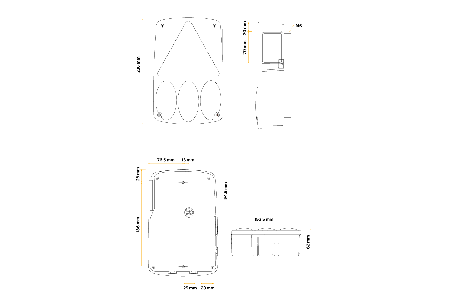 Die Earpoint IV Rückleuchte von ASPÖCK ist für den Einbau auf der rechten Fahrzeugseite vorgesehen und hat folgende Abmessungen: Breite 153,5 mm, Höhe 236 mm, Tiefe 62 mm. Ausgestattet mit einem 5-poligen Bajonettanschluss ermöglicht es eine einfache und schnelle Installation in Anhängern, Bussen und Abschleppwagen.