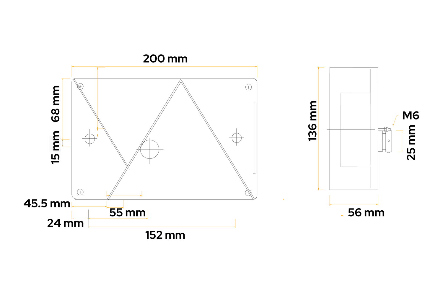 Die Multipoint IV Rückleuchte von ASPÖCK ist für den Einbau auf der linken Fahrzeugseite vorgesehen und hat folgende Maße: Breite 200 mm, Höhe 136 mm, Tiefe 56 mm. Ausgestattet mit einem 5-poligen Bajonettanschluss ermöglicht es eine einfache und schnelle Installation in Anhängern, Bussen und Abschleppwagen.
