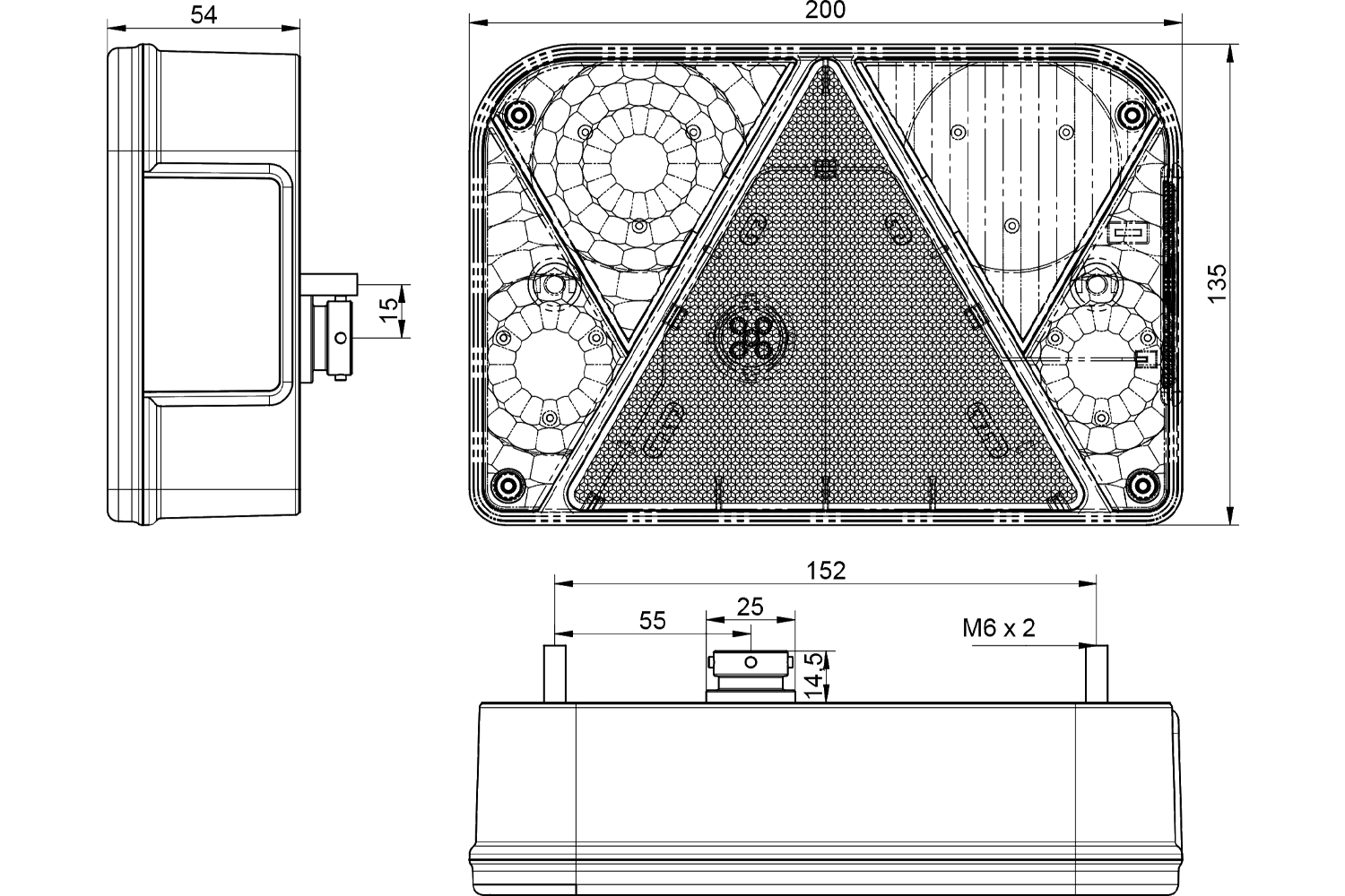 Die Rückleuchte DPT35 von DOBPLAST ist für den Einbau auf der linken Fahrzeugseite vorgesehen und hat folgende Abmessungen: Breite 200 mm, Höhe 135 mm, Tiefe 54 mm. Ausgestattet mit einem 5-poligen Bajonettanschluss ermöglicht es eine einfache und schnelle Installation in Anhängern, Bussen und Abschleppwagen.