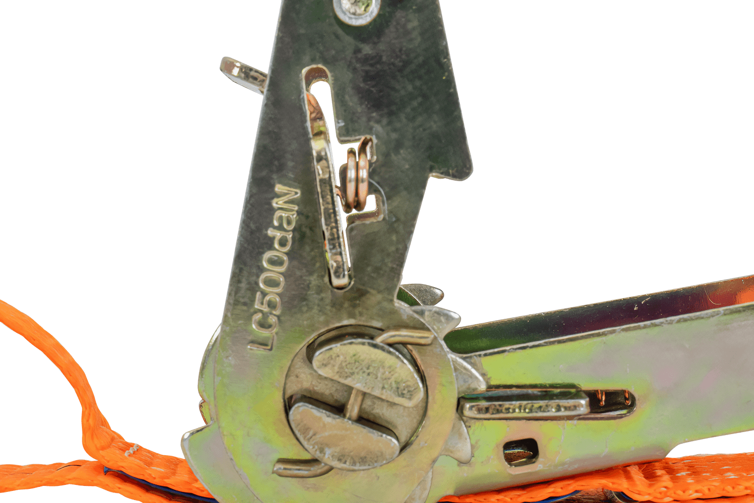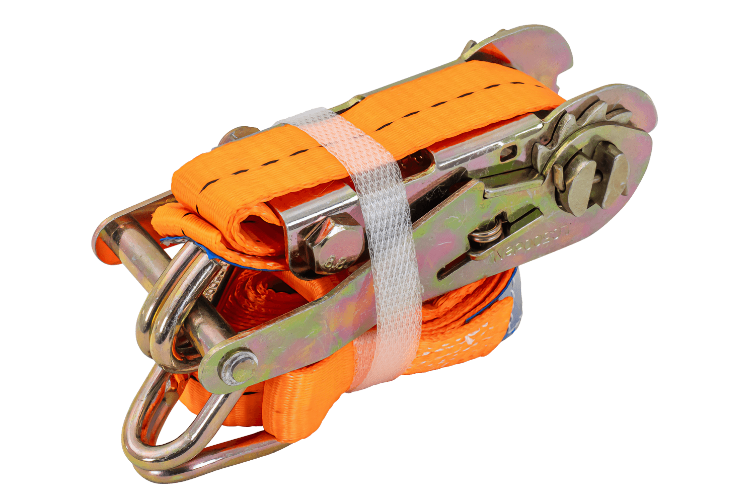Der orangefarbene UNITRAILER Ratschengurt besteht aus zwei Teilen: einem kürzeren Teil mit Ratsche und Haken sowie einem längeren Teil mit Gurt und Haken. Die Gesamtlänge des Gurtes inklusive Gurt und Schnalle beträgt 3 Meter und bietet somit ausreichend Länge für vielfältige Transportanwendungen. Der 25 mm breite Gurt bietet eine optimale Spannfläche. Der Gurt hat eine Zugfestigkeit von 1 Tonne (1000 daN) und sorgt so für sicheres Verzurren und stabile Ladungssicherung während des Transports.